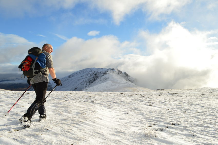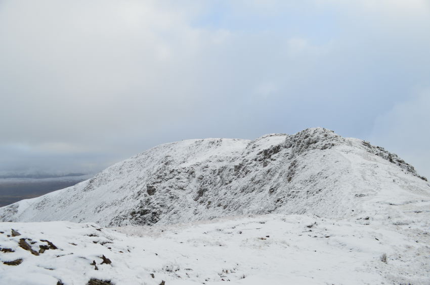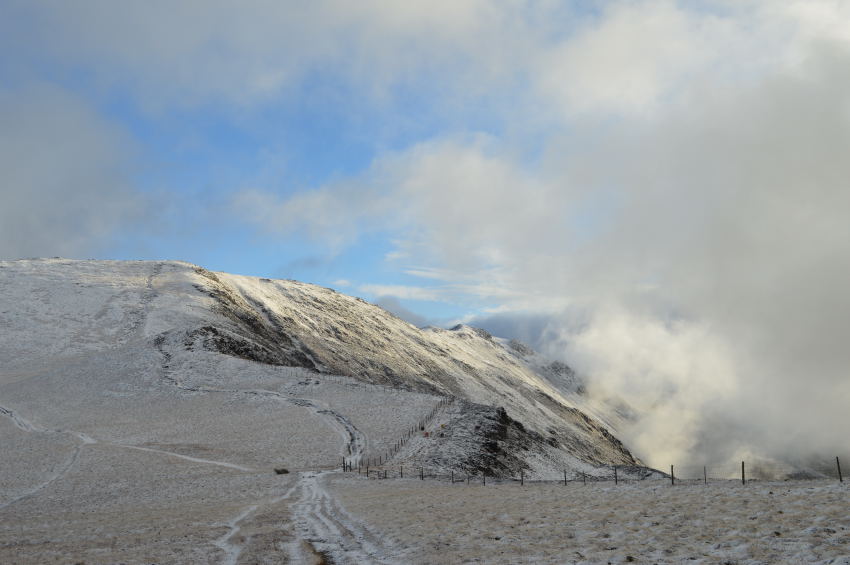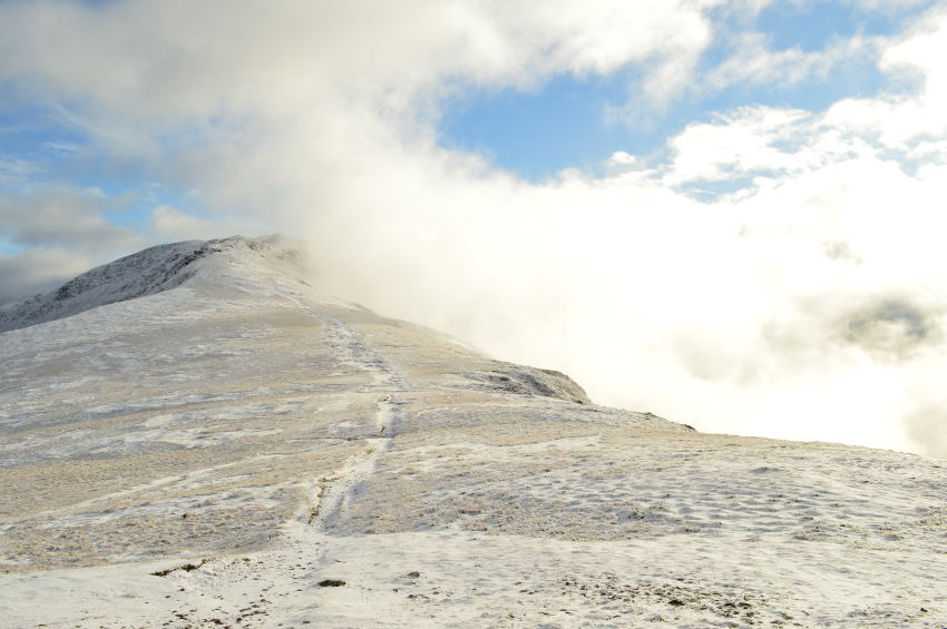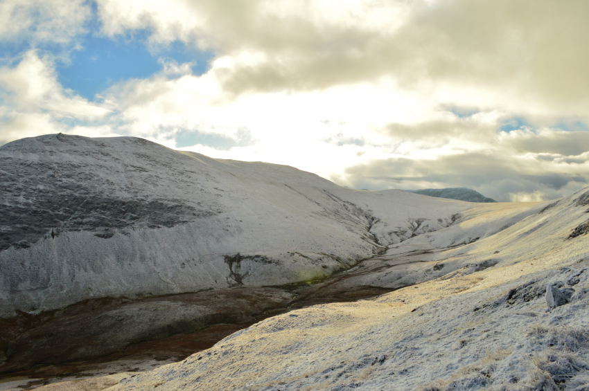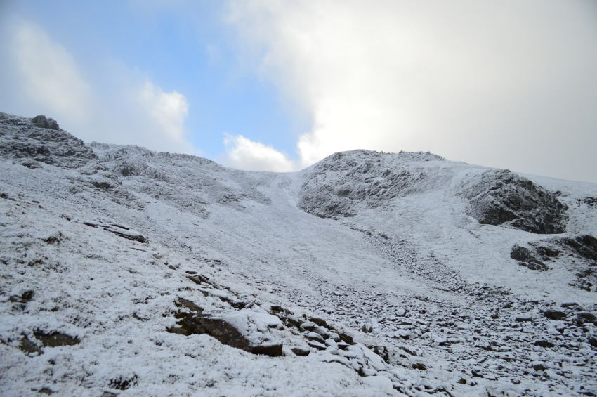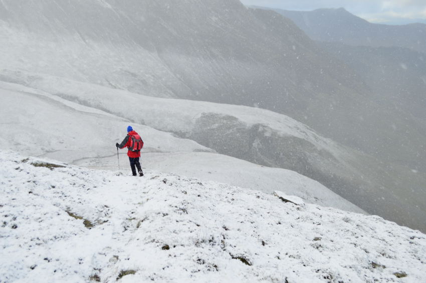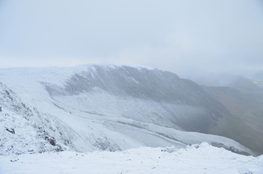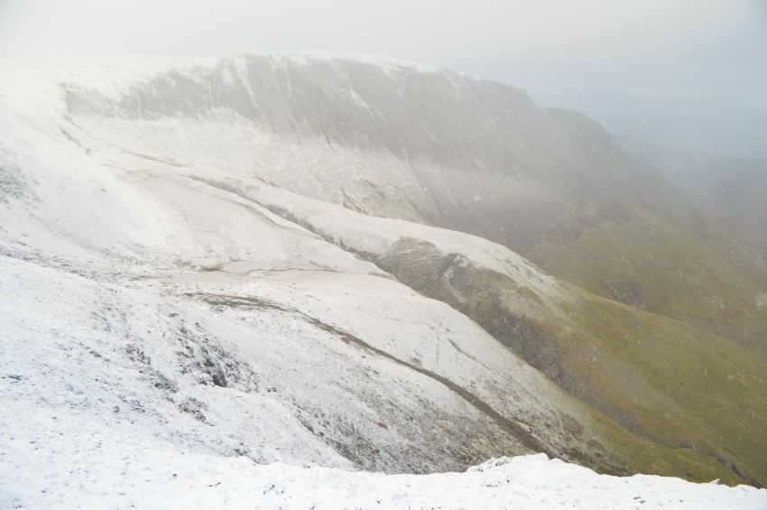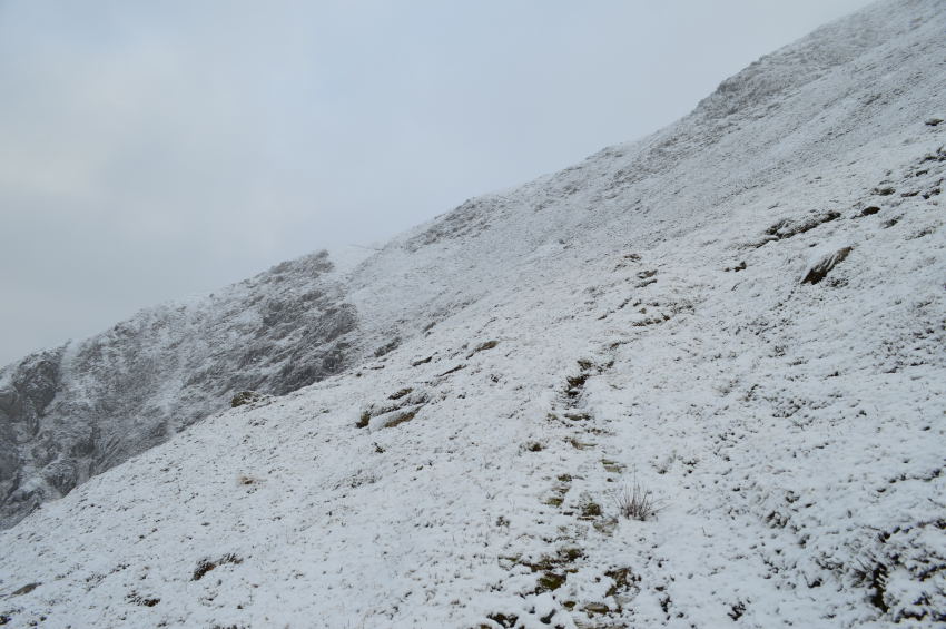 With every step forward the snow was starting to harden leaving that reassuring crunch as your boots walked over it, if you take a look in the right of the photo some parts of the fell side still had the tops of the grass pertruding from the snow such its shallow depth. |