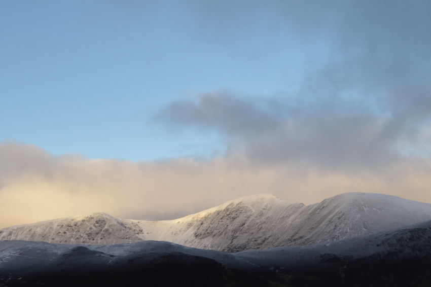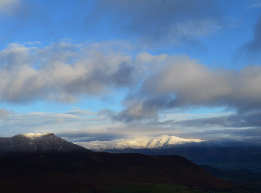 Skiddaw seen beyond a silhouetted Causey Pike. |