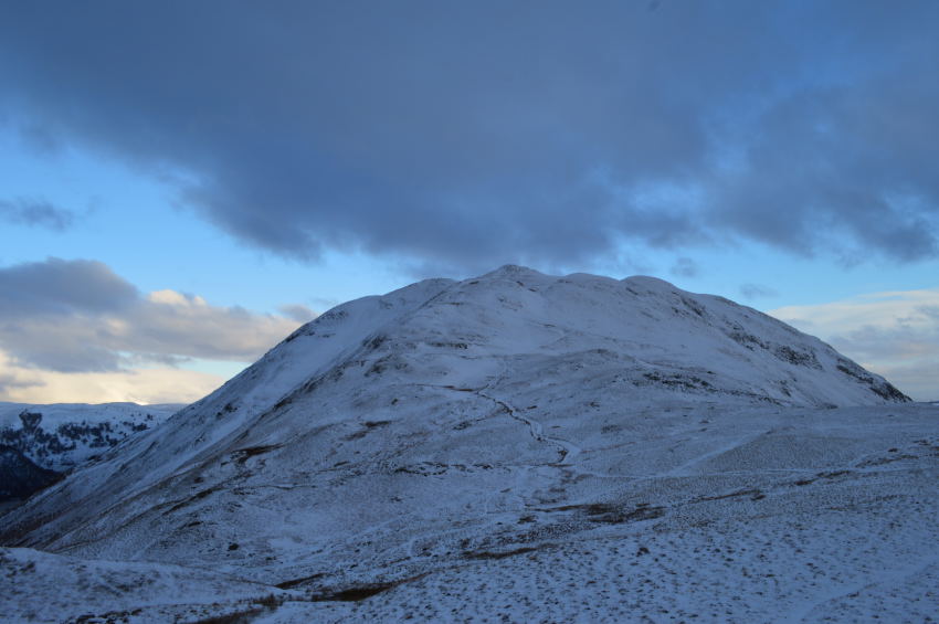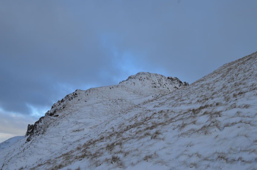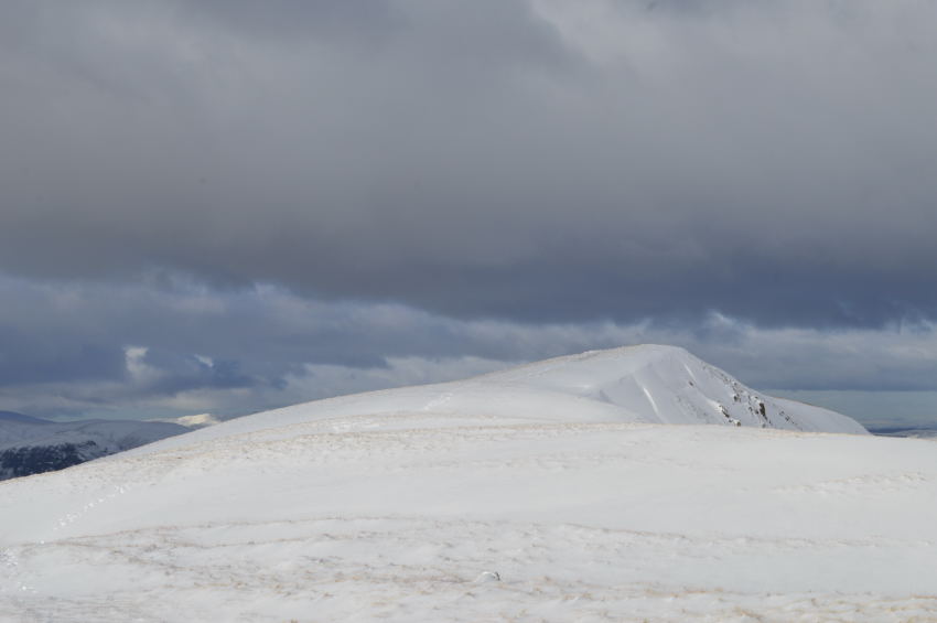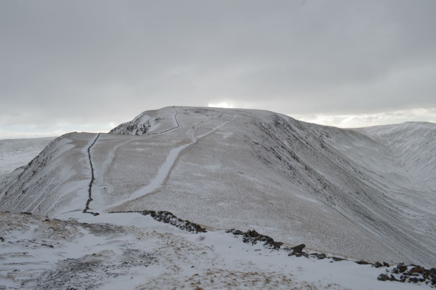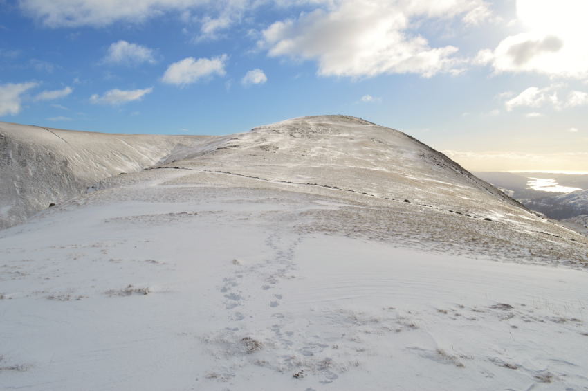 The fresh snow was avoidable as I used the edges of the path, however, after leaving the main path for the summit I soon found myself striding through deep unavoidable snow. My only way ahead was to leave the path & keep with the fell side where the snow hadn’t accumulated above much of the grass tops. |