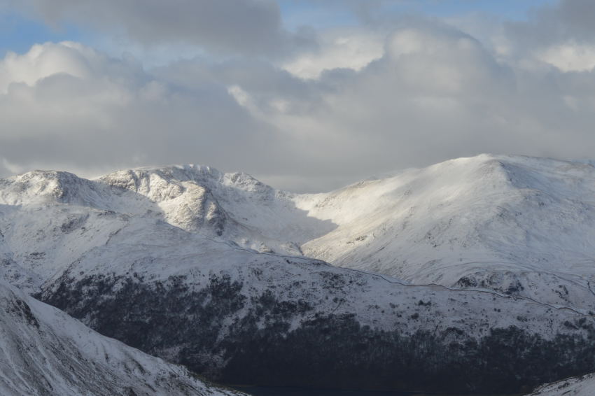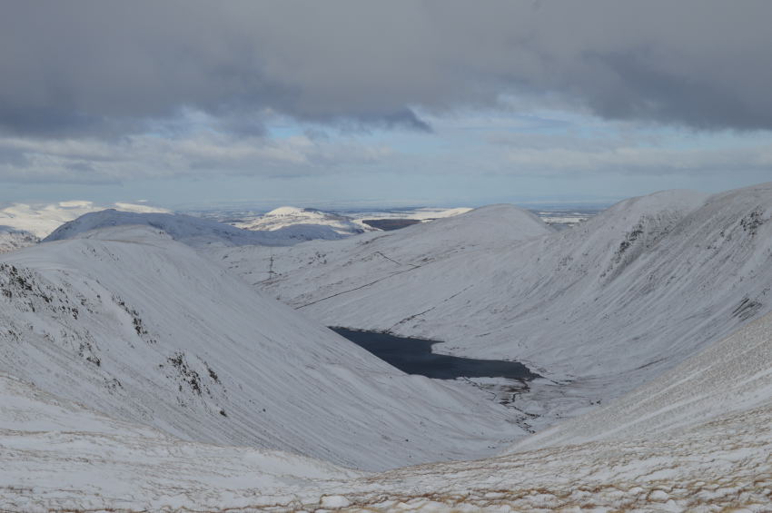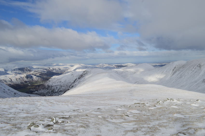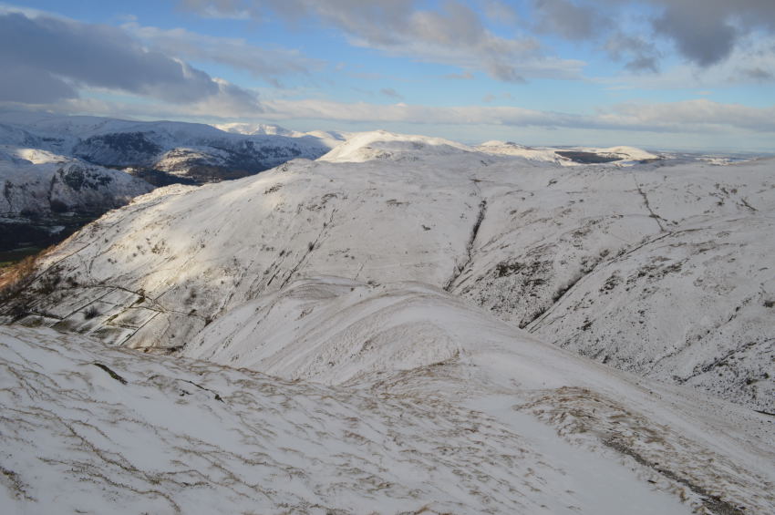 Once I had passed Stony Rigg to my left my view soon opened up again over Dovedale & the Deepdale valleys where the cloud had now lifted revealing the snowcapped summits of Dove Crag, Hart Crag & Fairfield. |