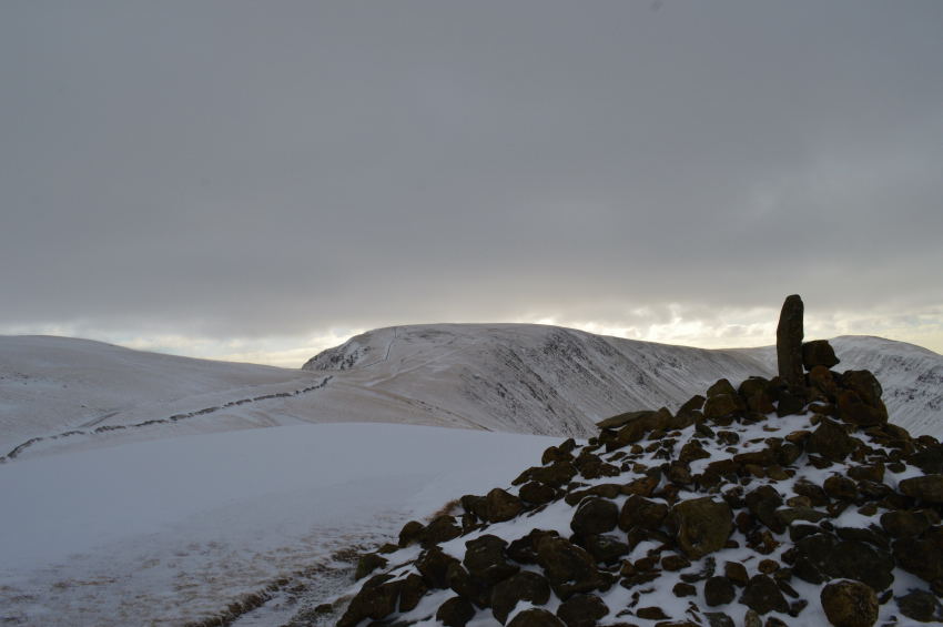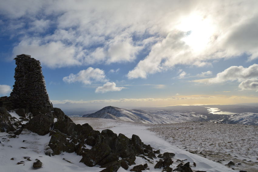 Thornthwaite Crag beacon appears with the Coniston Fells in the far distance. |