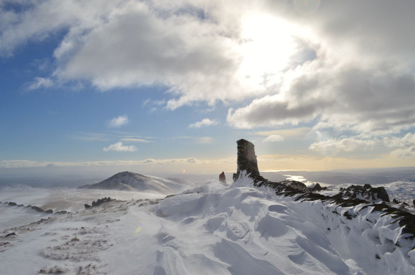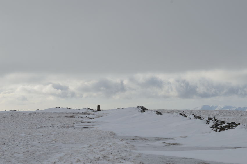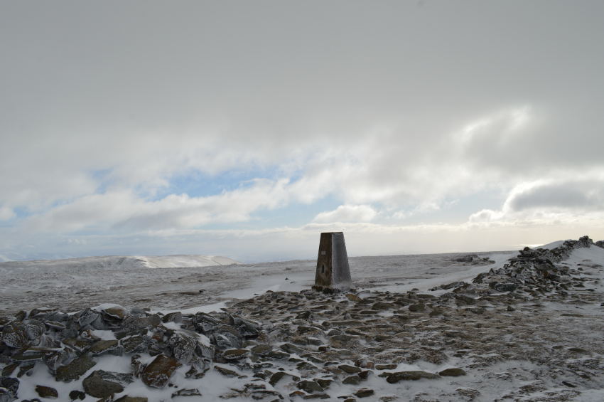 I got a cheery hello by the time I arrived, the three walkers who had just arrived were sitting out the wind behind the cairn, one of whom was holding up a wind meter which read 27.4 mph with a whopping -13.1° Wind chill, I smirked whilst wiping my nose & they too saw the funny side which I can only put down to being Brits.