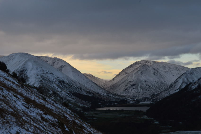 It wasn’t the fact that I had been away for a couple of weeks why Lakeland felt a little strange, dare I say deserted as I drove along the shoreline of Ullswater not passing one car along the way, I put this down to the Kirkstone Pass being closed at Hartsop. Outside the car windows pre-dawn views were bleak but snow topped summits were seen through a null of variations of grey cloud, a world away from what the forecasters had predicted.