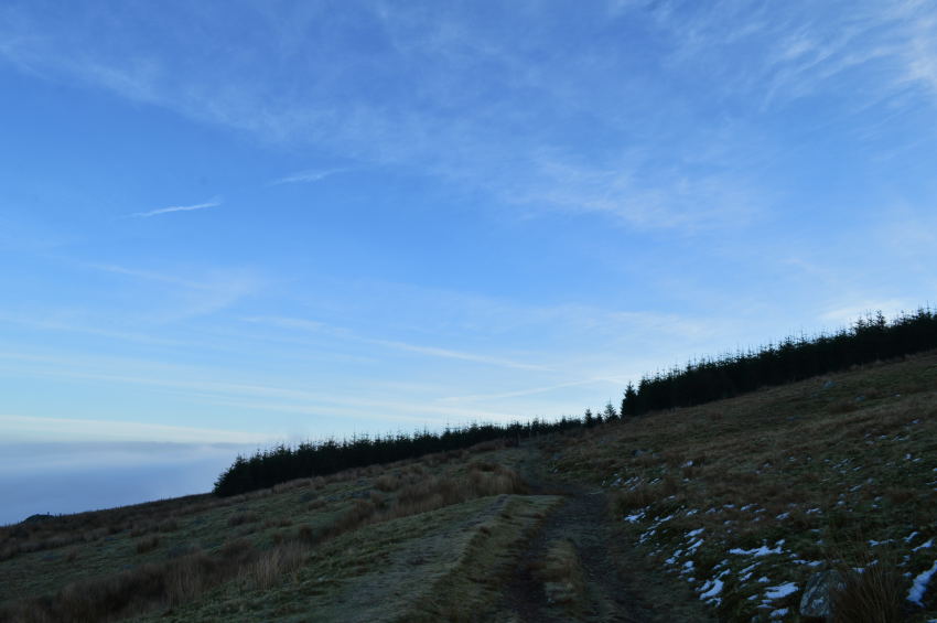 Our frozen ground had been well grazed underfoot & was a joy to walk over in the early morning light yet something magical soon caught our eye with the more height we gained, as it seemed we were now walking through a mist patch which came more apparent as we topped out over the pine trees to the left of our path, it was only then did we notice that as far as our position & beyond Blake Fell a full on Cloud Inversion was creeping its way in. |
