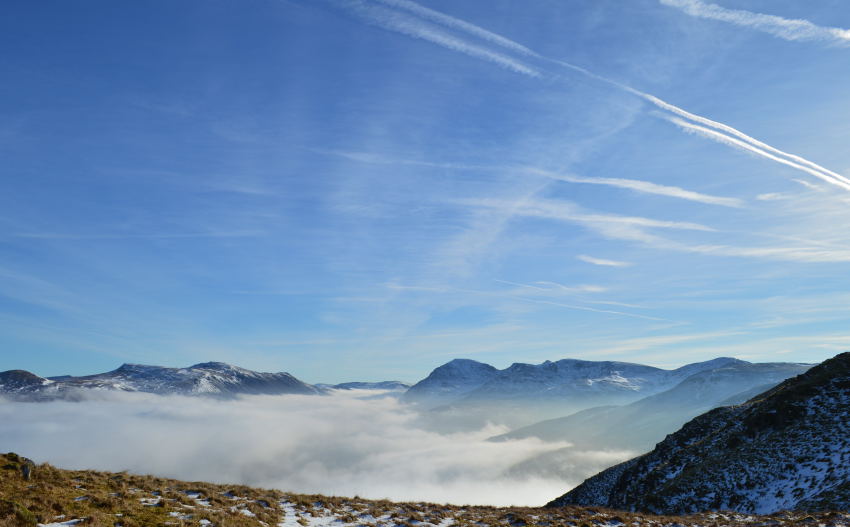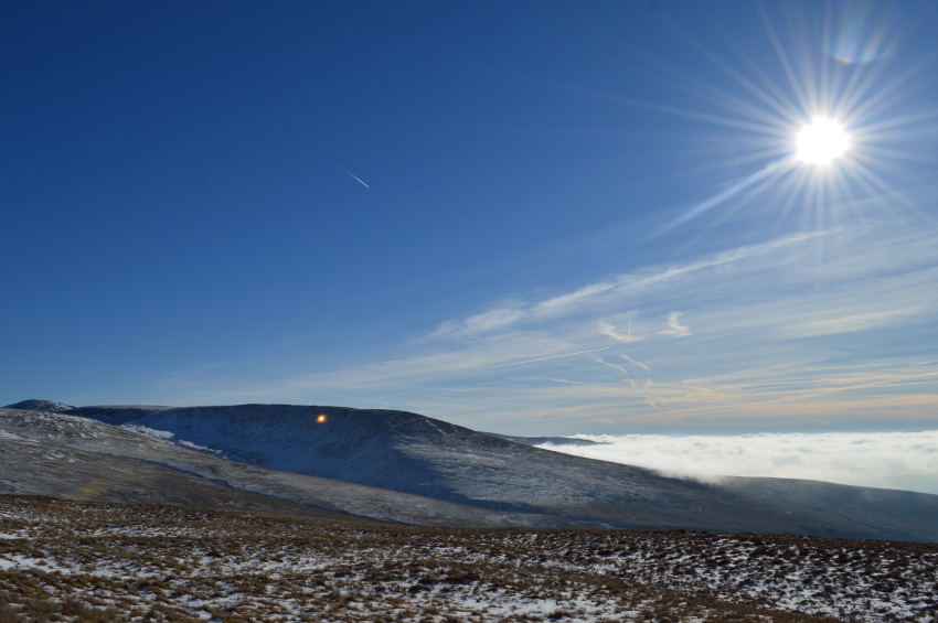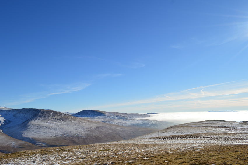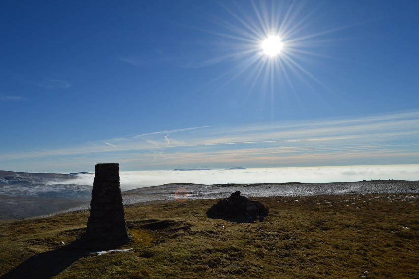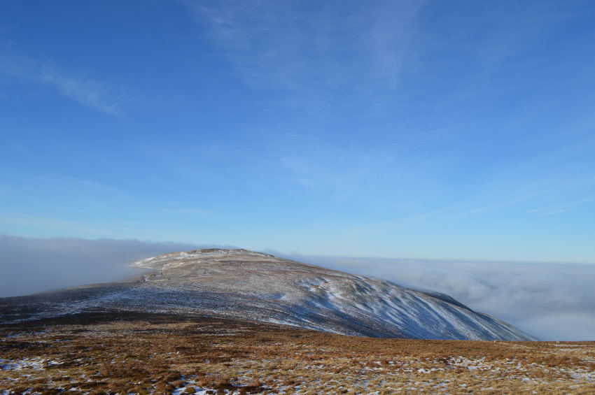 We had a wander over to the subsidiary summit where we stood & ate lunch all the while the sun was beating on the back of our necks, it was almost too unreal to be true to have have the white snow beneath our boots, blue skies above our heads & Cloud Inversions in every direction which stretched all the way to the Solway Firth in Scotland.