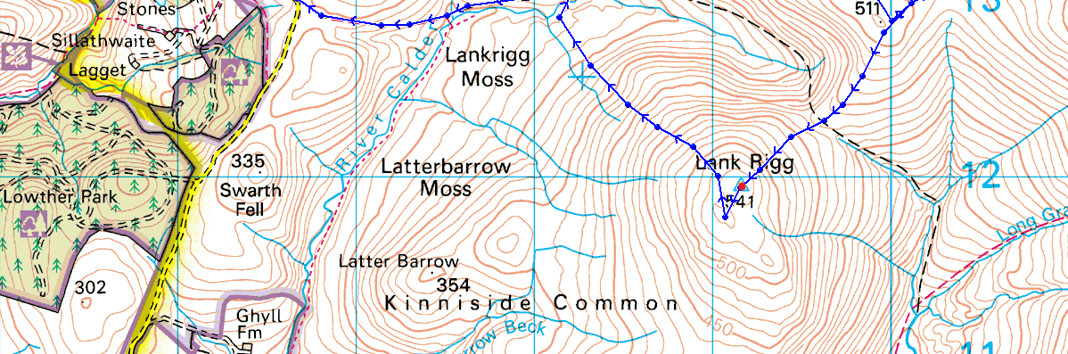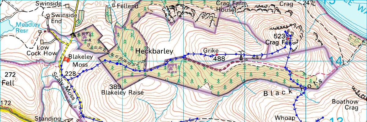 Cold Fell road – Blakeley Moss – Grike – Crag Fell – Black Pots – Whoap – Lank Rigg – Lankrigg Tarn – Lankrigg Moss – River Calder – Cold Fell road |