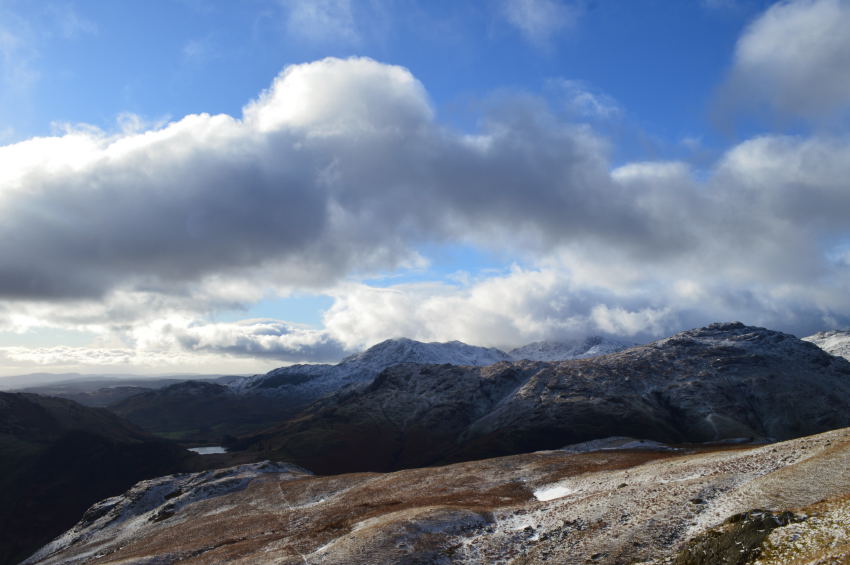 Looking back on the Langdales Pikes with the Coniston Fell beyond. |
