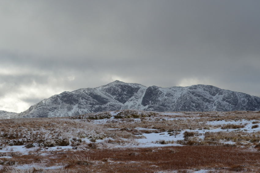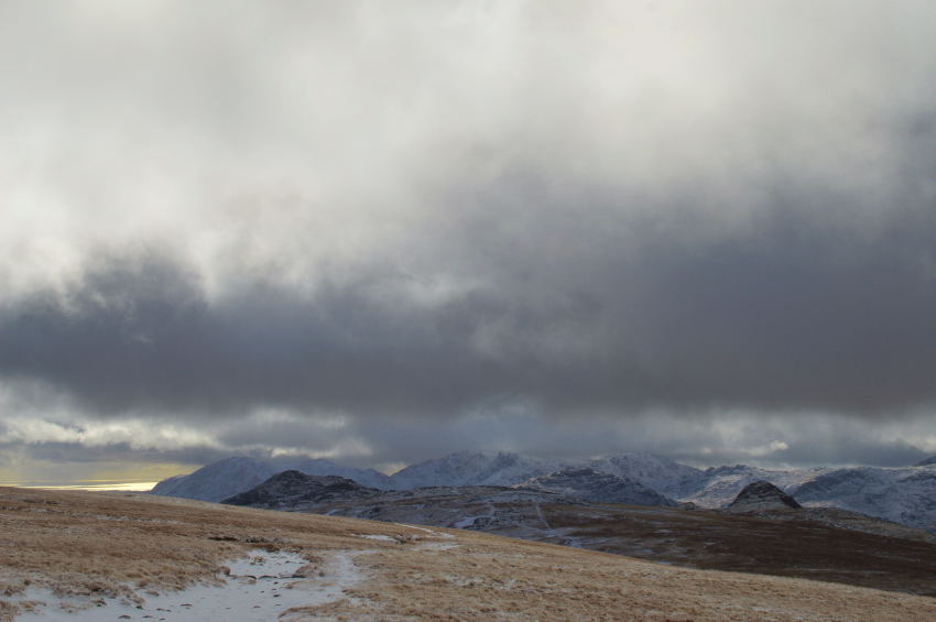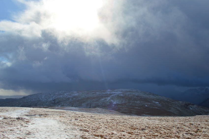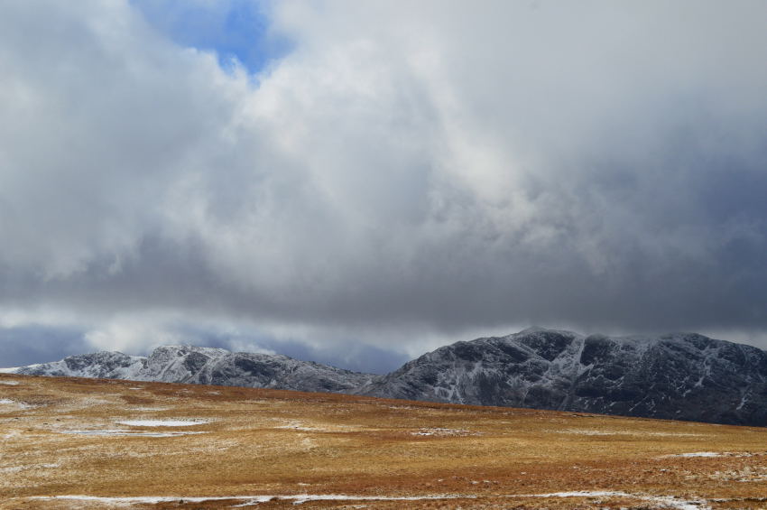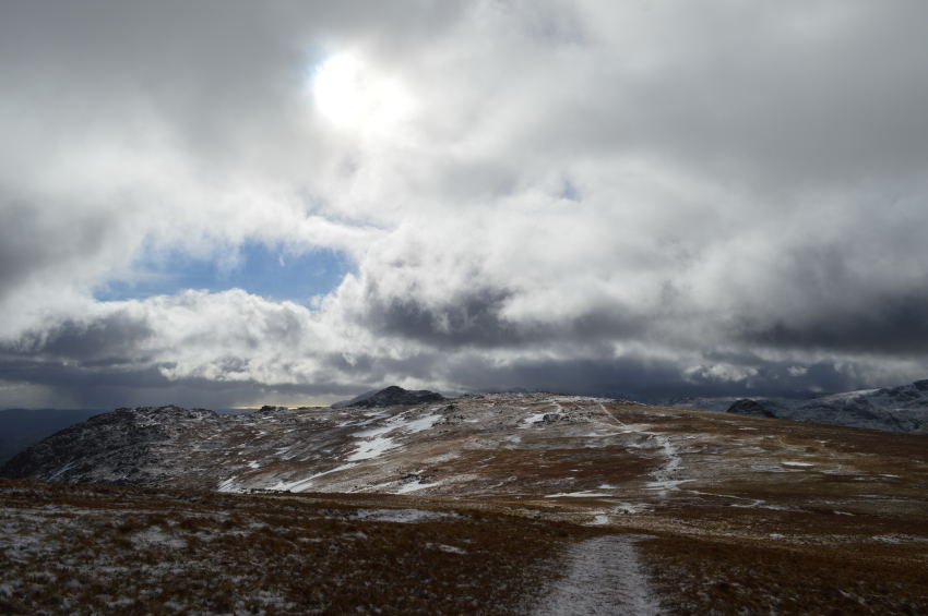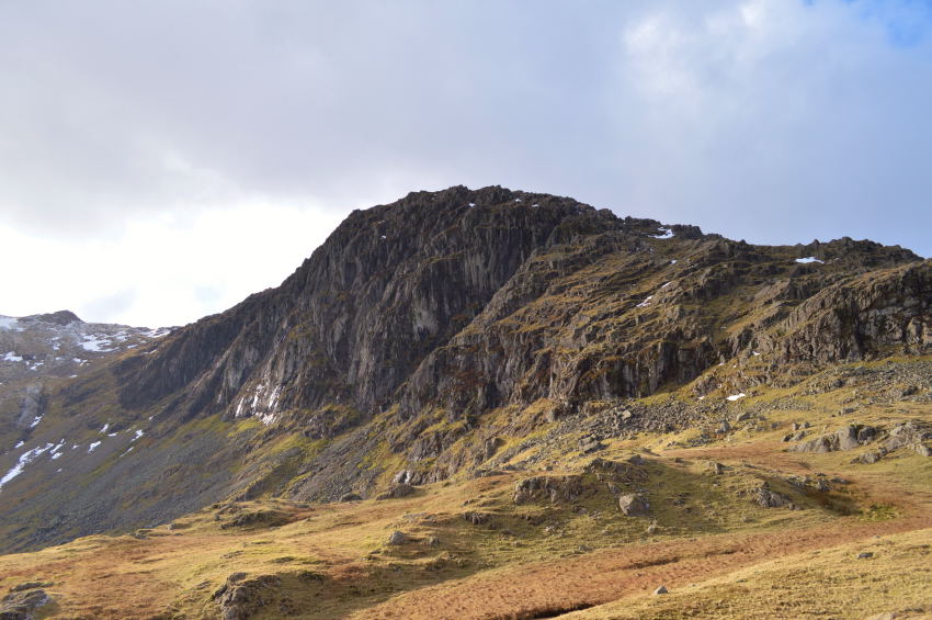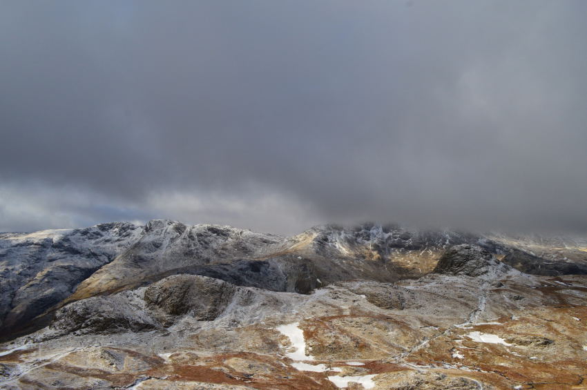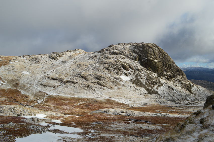 Harrison Stickle catches a hint of sunshine seen shortly before I summit Loft Crag. |