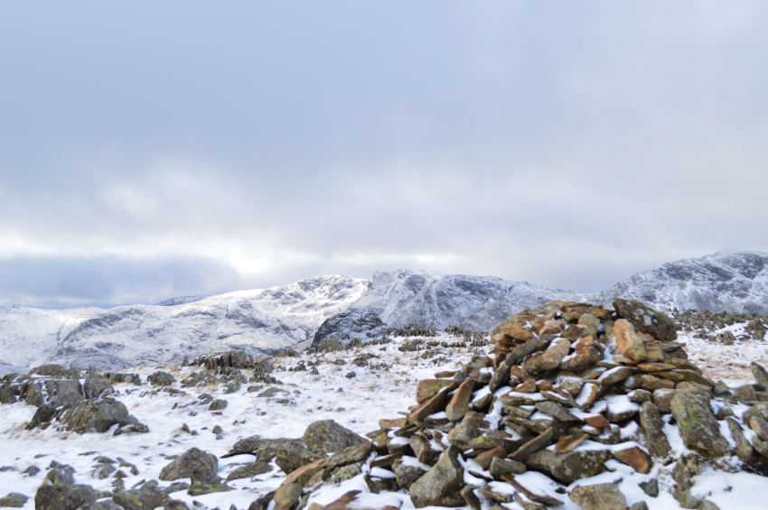 Thunacar Knott (south summit) cairn with Bowfell & Crinkle Crags in the distance. |