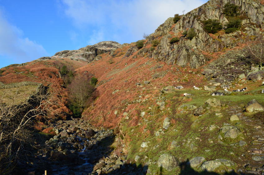 Options opened up as soon as I hit open fellside, it was tempting to stay on the broad path which follows Stickle Ghyll on both sides, however my route today as already mentioned would see me navigate Dungeon Ghyll & Dungeon Ghyll Force before a steep climb to gain Pike How, which meant as soon as I had left Stickle Barn behind me, it was time for a left turn. |