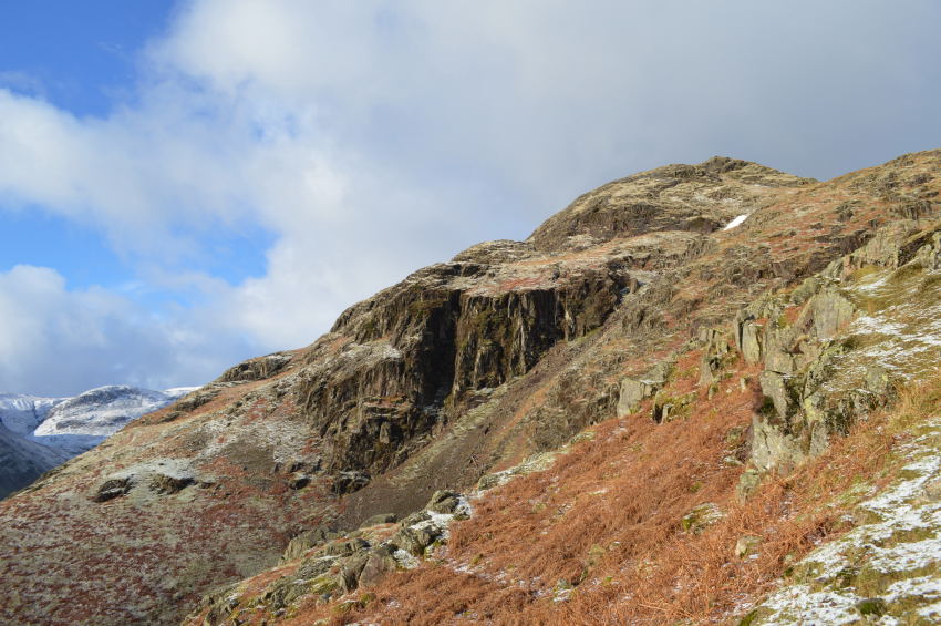 I picked my way over Harrison Comb following the wide path that crosses the early stages of Dungeon Ghyll where here it flows as a gentle stream. My path navigates around a column of crags before doubling back, it was before I round said crags do I spot a cheeky faint path which lead me directly onto Loft Crag's lower shoulder from where a short walk is required before reaching the summit. |