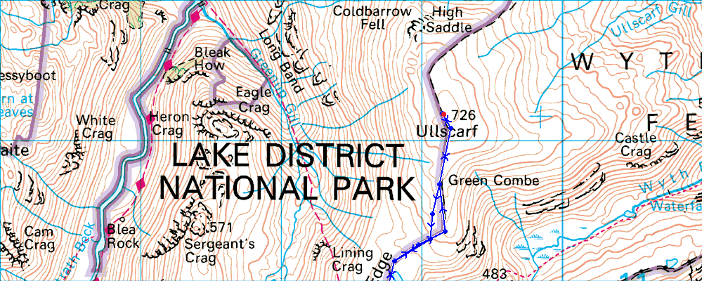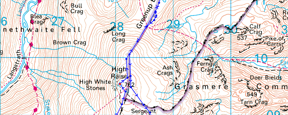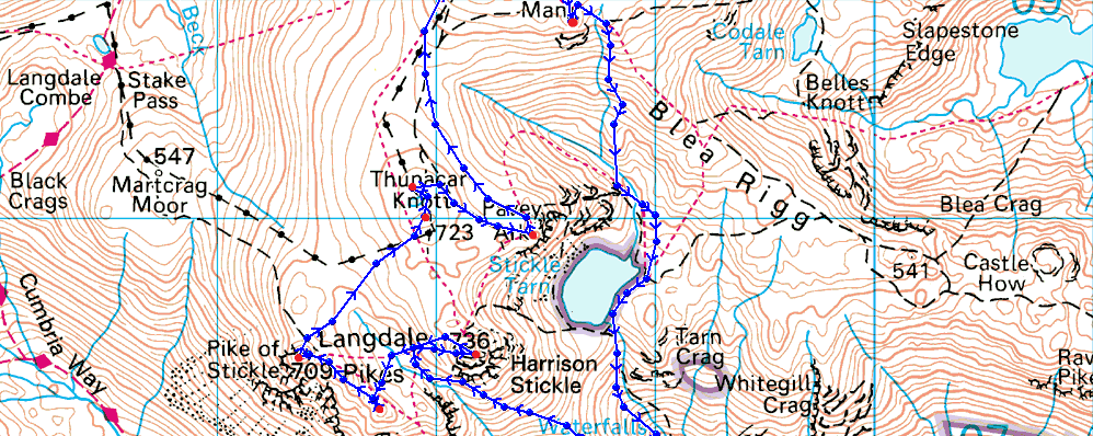 Stickle Barn - Pike How - Harrison Stickle - Loft Crag - Pike O'Stickle - Thunacar Knott - Pavey Ark - High Raise - Low White Stones - Greenup Edge - Ullscarf - Greenup Edge - Low White Stones - High Raise - Sergeant Man - Stickle Tarn - Stickle Ghyll - Stickle Barn |