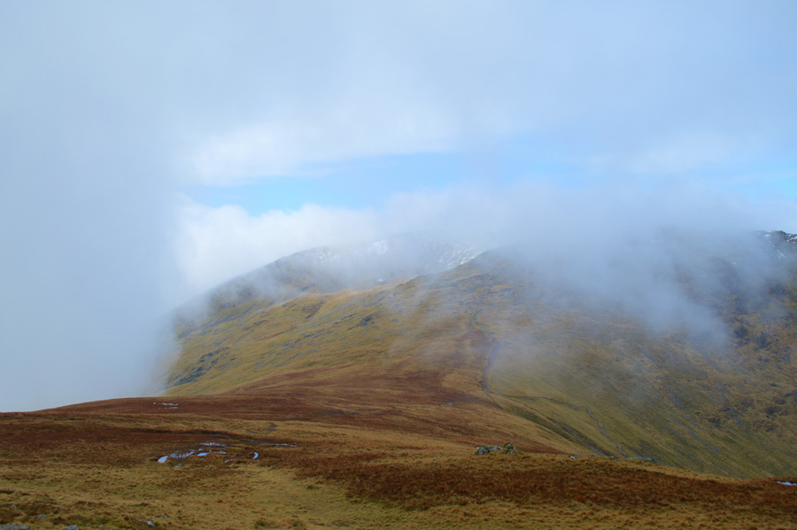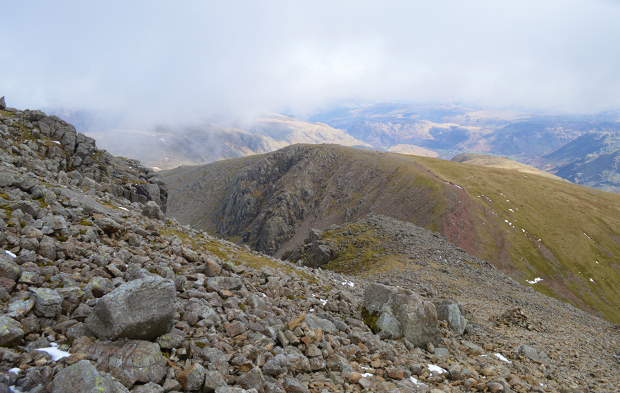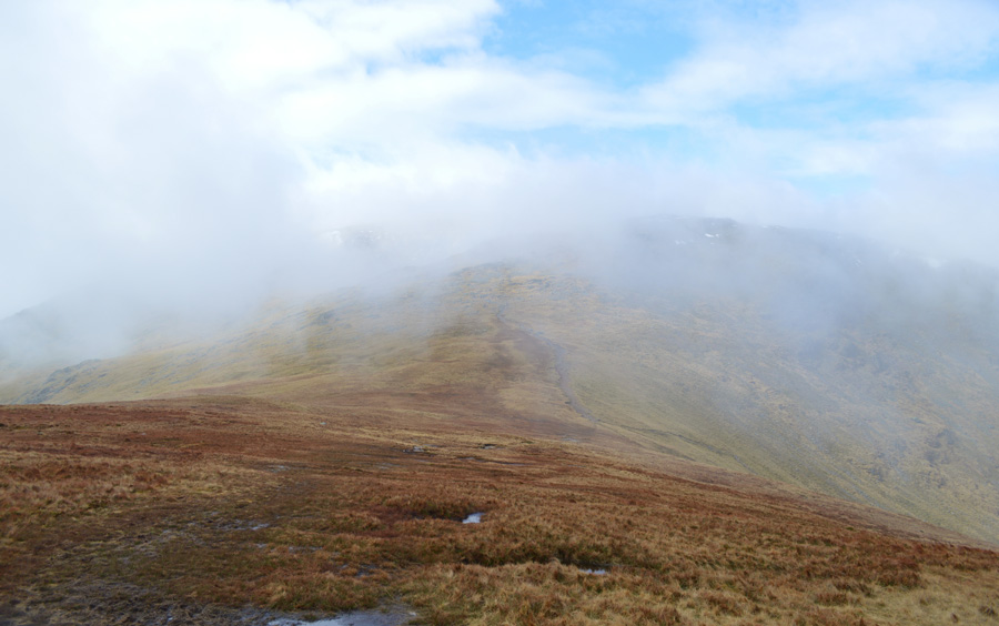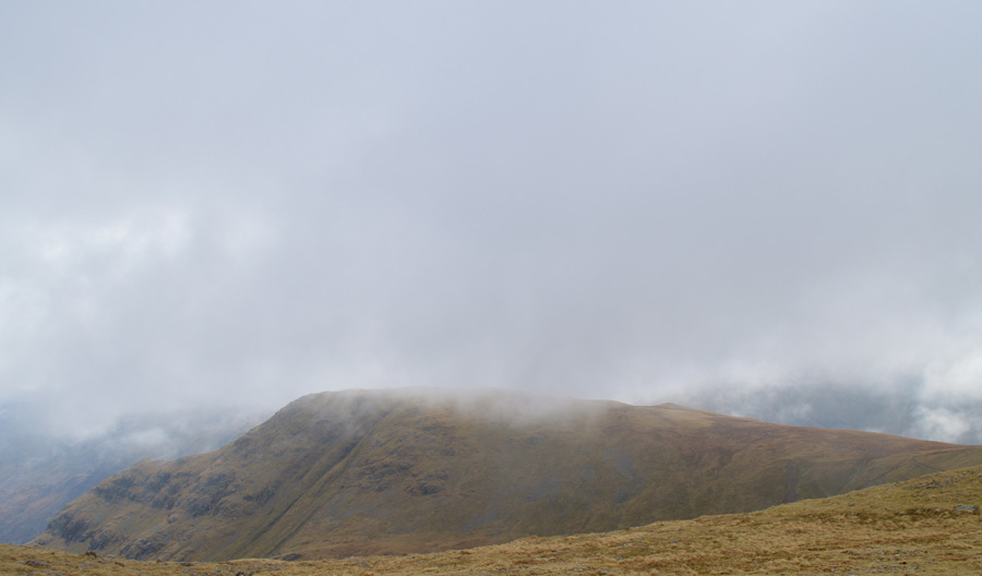 The cloud begins to lift again as we cross Gillercomb Head revealing Base Brown. |