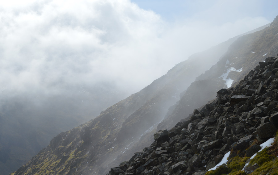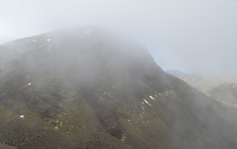 With having no views time spent sadly on Base Brown summit was brief to say the least as we soon turned tail & headed back across the col towards Green Gable, with the cloud just above our heads the hints of blue we had seen not ten minutes earlier had quickly been forgotten.