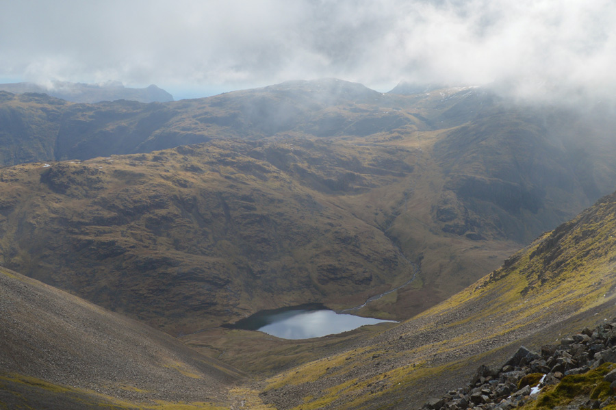 Although they can't be seen there are flocks of walkers on the path besides Styhead Tarn, all heading for Scafell Pike no doubt. |