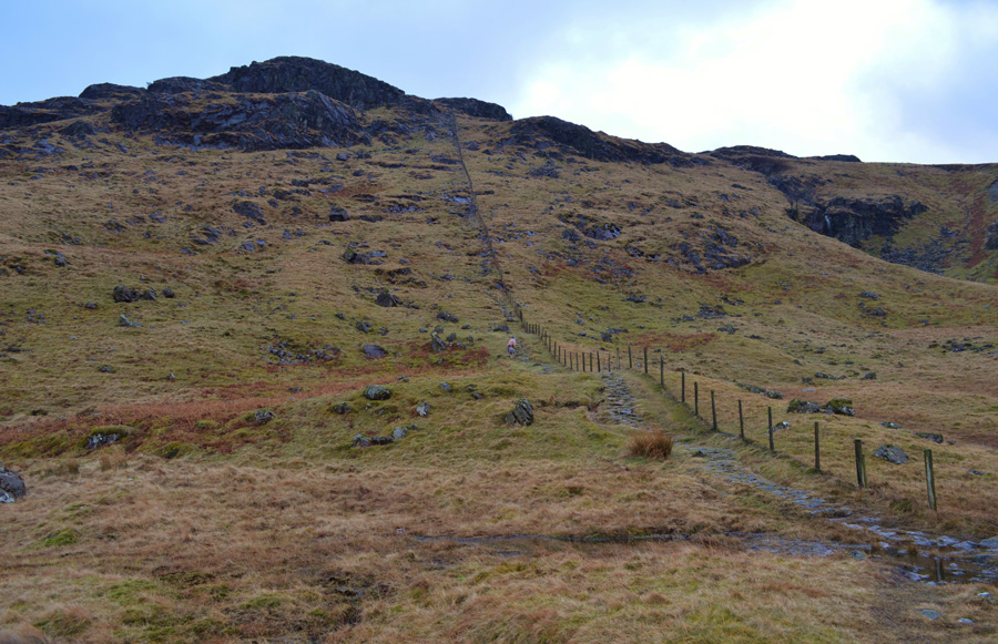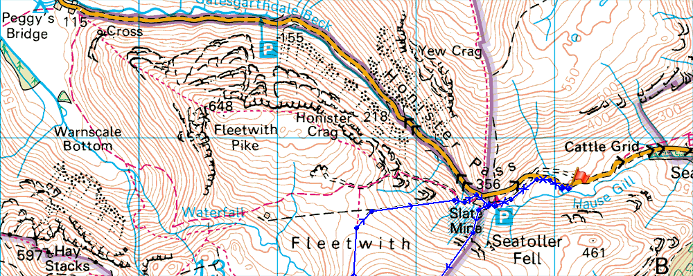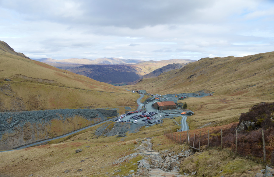 Our route up Grey Knotts, taken behind from behind Honister Mine. |