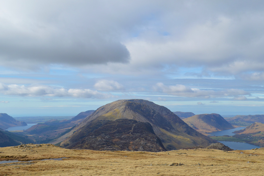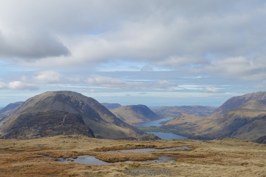 To our right Brandreth falls away over gentle grassy slope while our views north west are dominated by High Crag, High Stile & Mellbreak, on the other side of Crummock water sits Rannerdale Knotts awaiting its Blue Bell display while Low Fell & Fellbarrow can be seen at the far end of Crummock Water.