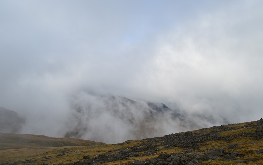 Views in the direction of Kirk Fell under swirlling cloud. |