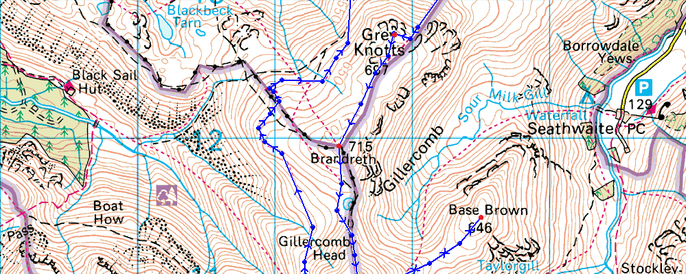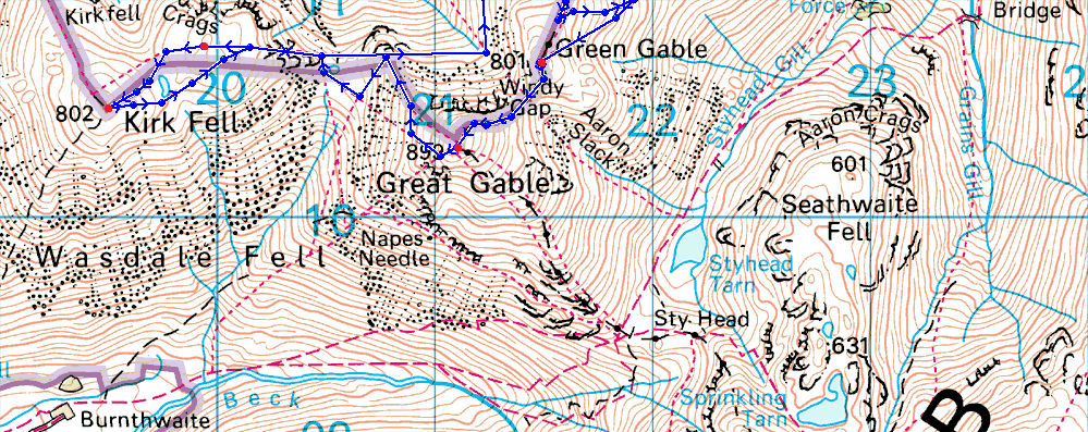 Honister Pass – Grey Knotts – Brandreth – Base Brown - Green Gable – Windy Gap – Great Gable – Beck Head – Kirk Fell (North Top) – Kirk Fell – Beck Head – Moses Trod – Drum House – Honister Pass |