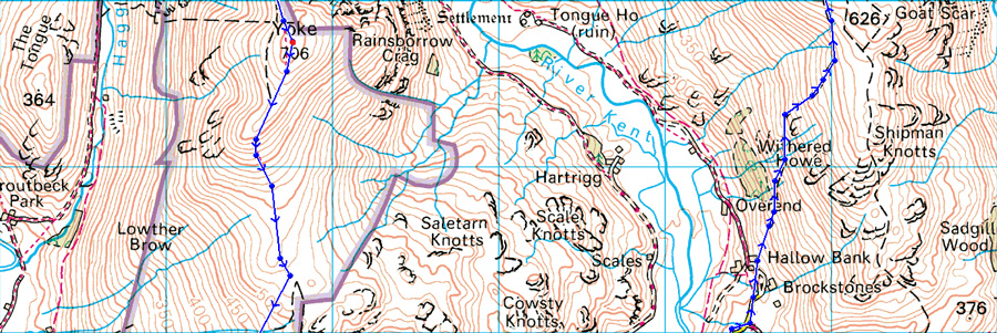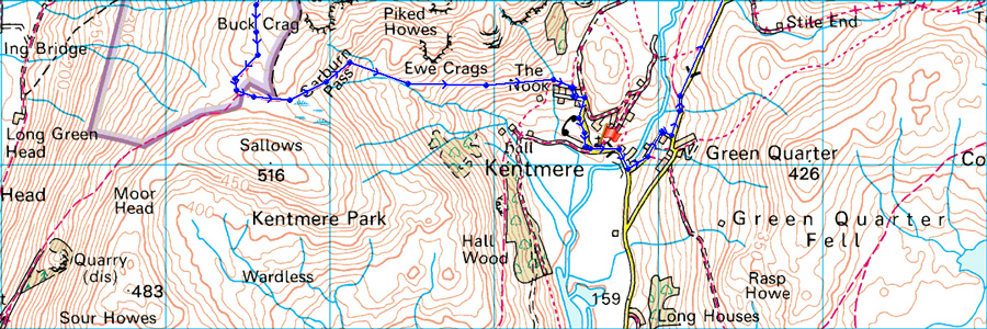 Here, looking back up along the Garburn Pass with Badger Rock seen over the stone wall. |