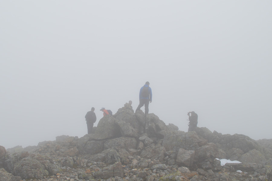 I trace my way from Calf Cove Col following the familiar stone cairns all the way to a deserted summit cairn, behind me voices carry through the wind as I am soon joined by three walkers and their dog, closely followed by the couple I had seen sheltering not ten minutes earlier. The guy holding the camera in the photo remarked on what a 'fine day' it was as I replied 'pardon' yes of course I replied, but subconsciously I had to disagree, more so on my ever increasing worrying thoughts on if this cloud was going to lift, I needed it to happen soon. |