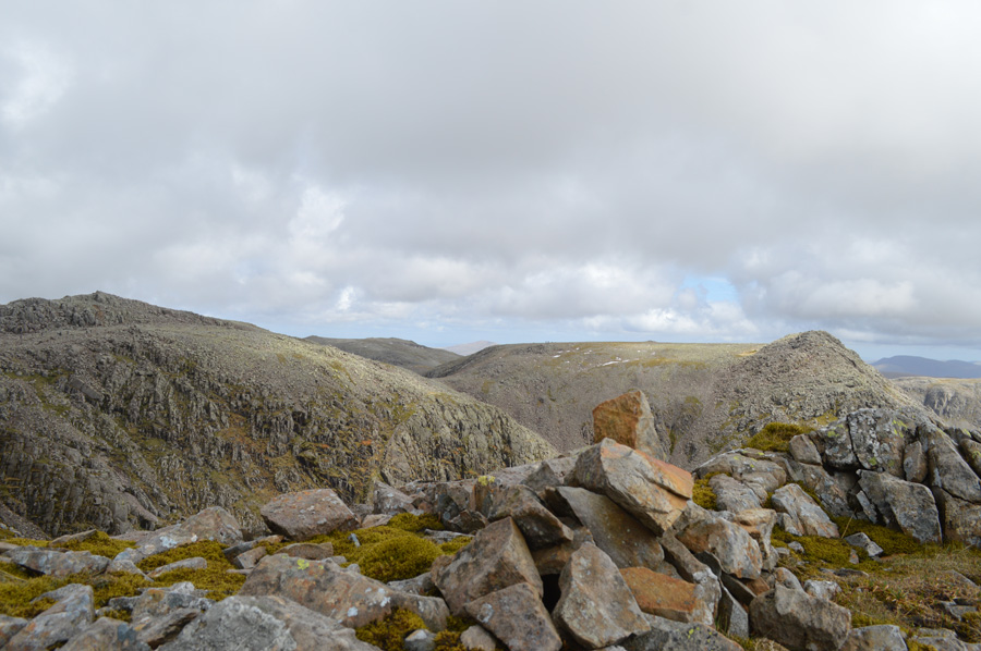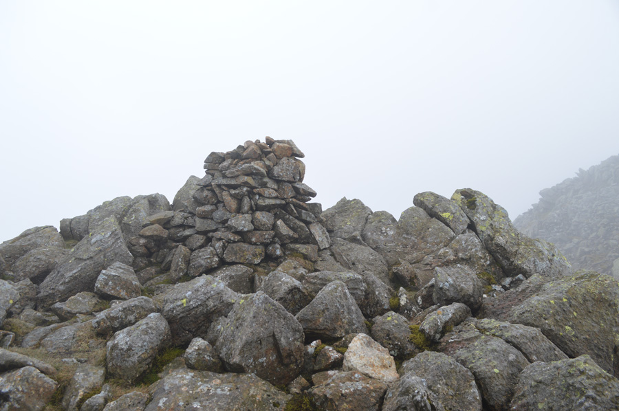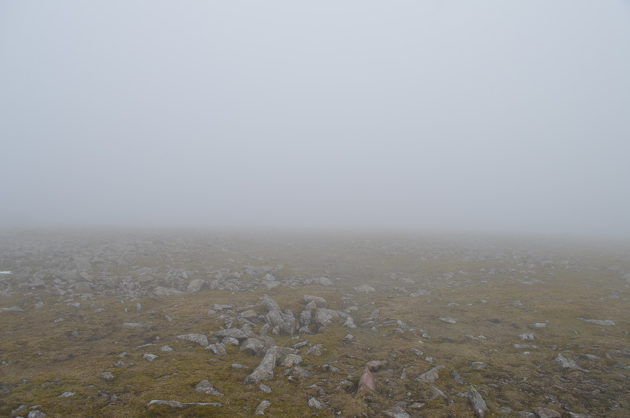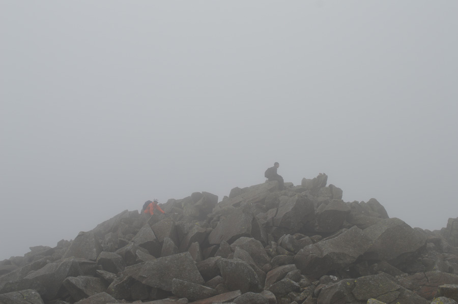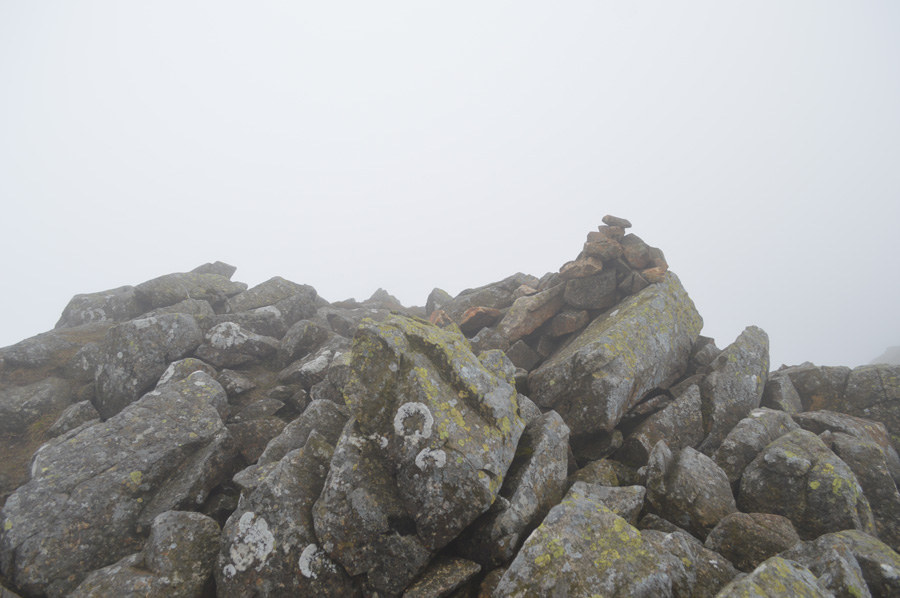 I found myself a good spot out of the wind from where I could here voices carry from the main path below me, at times so close I expected them to venture out at the summit but I guess this was the wind playing tricks on me. De-shouldred I placed my back against a large boulder and watched as the cloud drifted across the rock strewn summit plateau, at times ghostly outlines detailing distant rock formations peered through gaps in the cloud, other times there was nothing to see but a twenty yard circumference around me.