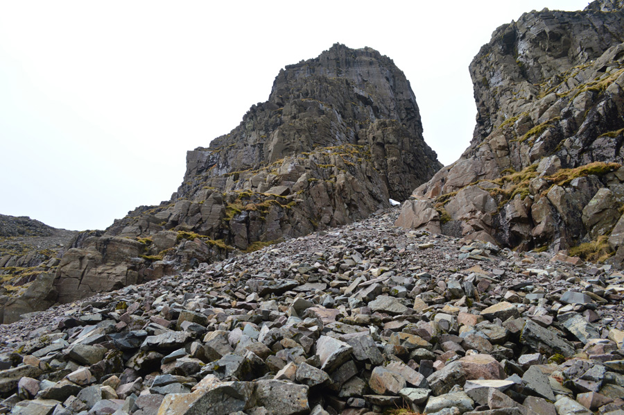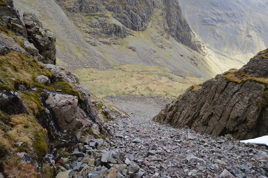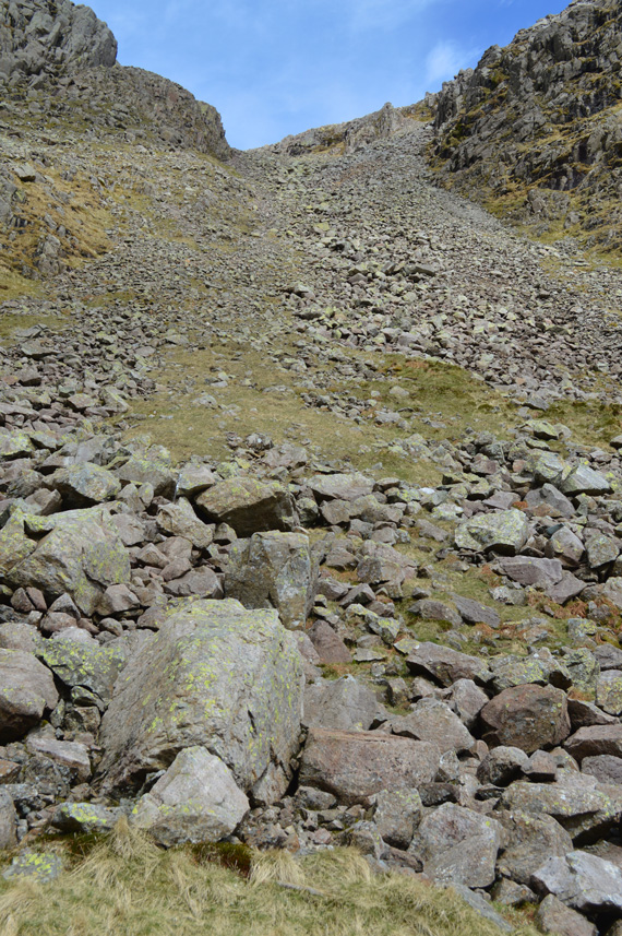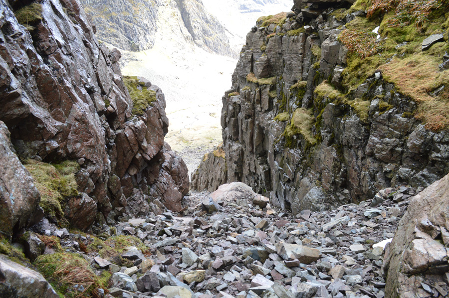 Further up the scree the gully narrowed and large rocks had naturally built up on both sides made for a better purchase than the centre of the gully. |