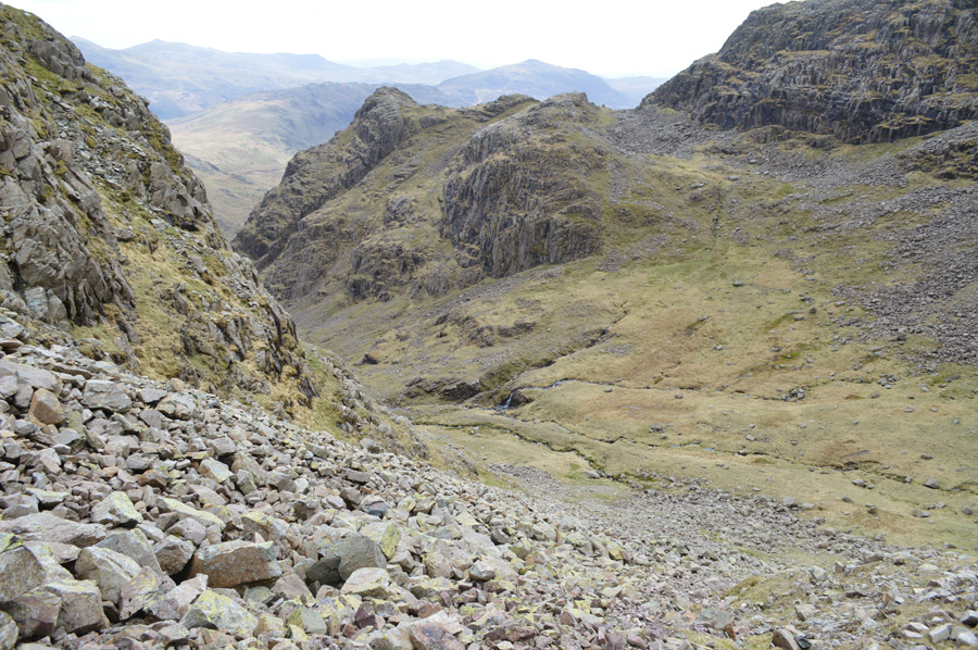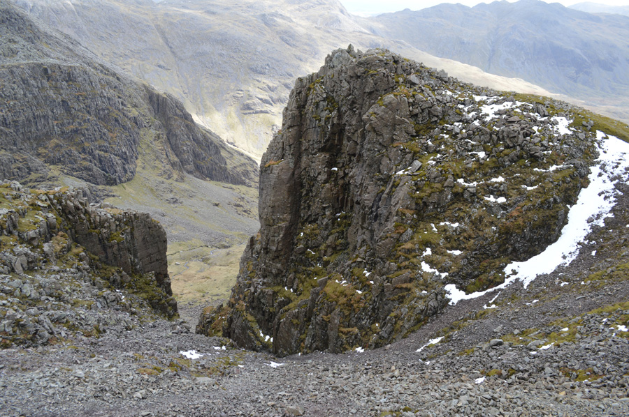 I don't know why I sound so happy because III Crag Col seen with the steep scree running below is my route back onto the ridge. |