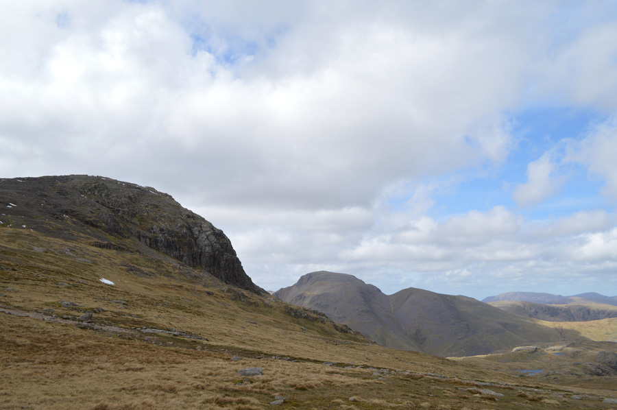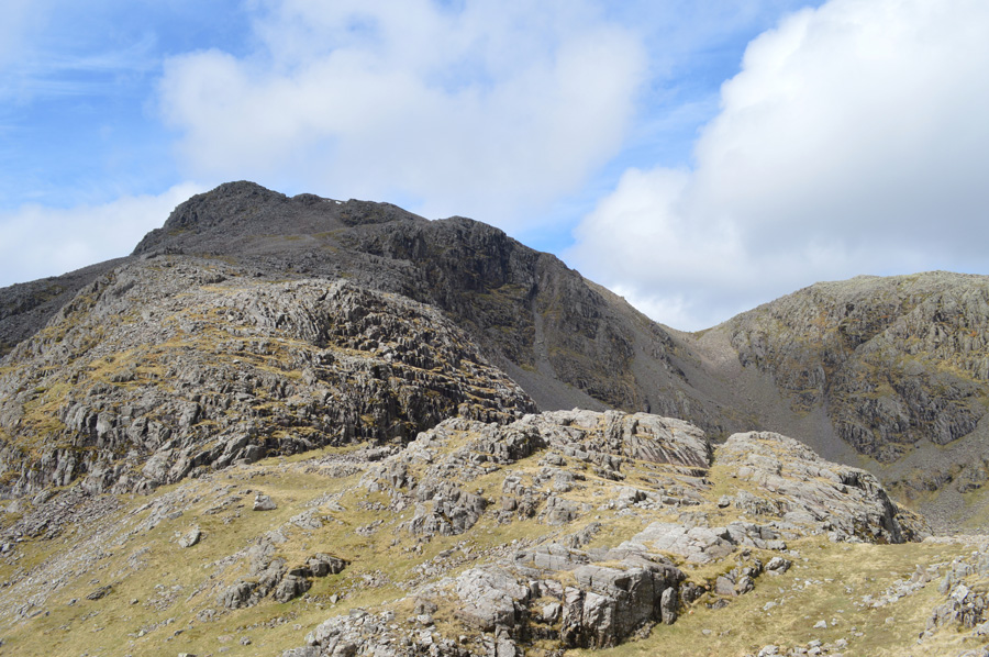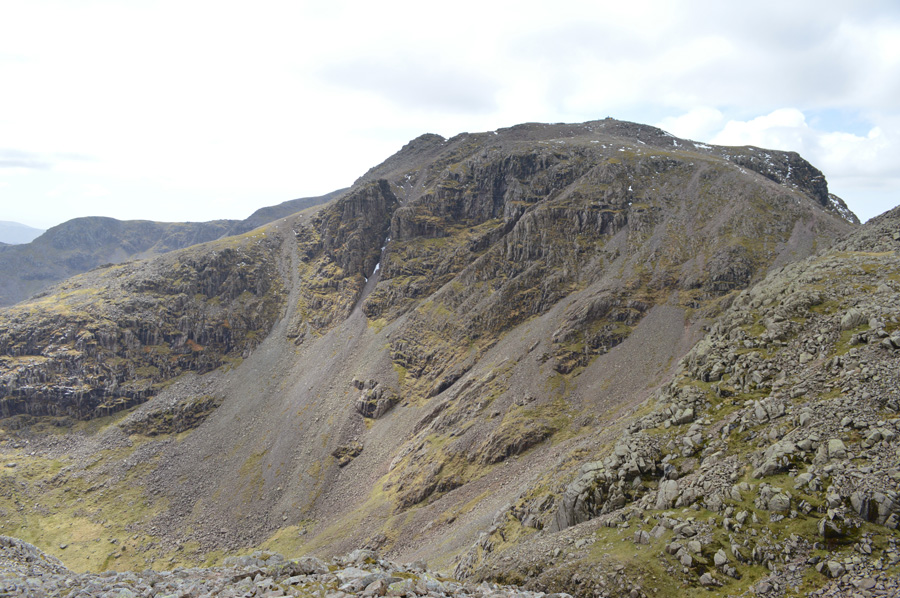 Scafell Pike and Scafell East Buttress seen after descending Rough Crag. |