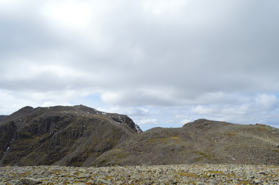 Broad Crag seen with Scafell Pike, as walkers continue making thier ascents. |