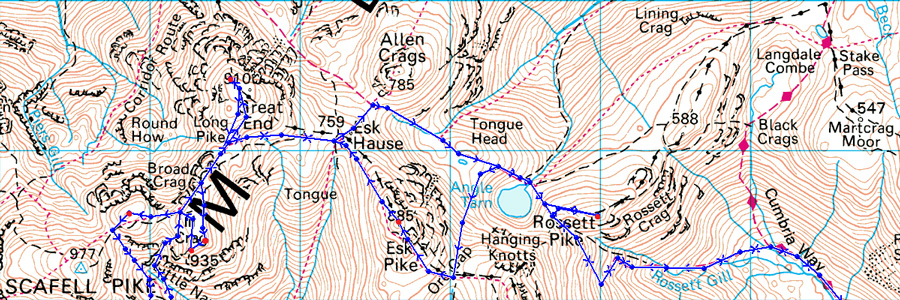 ODG - Mickleden - Rossett Gill - Rossett Pike - Angle Tarn - Ore Gap - Esk Pike - Esk Hause - Calf Cove - Great End - Ill Crag North Top - III Crag - Broad Crag - Broad Crag Col - Little Narrowcove - Rough Crag - Pen - Ill Crag South Scree - Calf Cove - Esk Hause - Angle Tarn - Rossett Gill - Mickleden - ODG |
