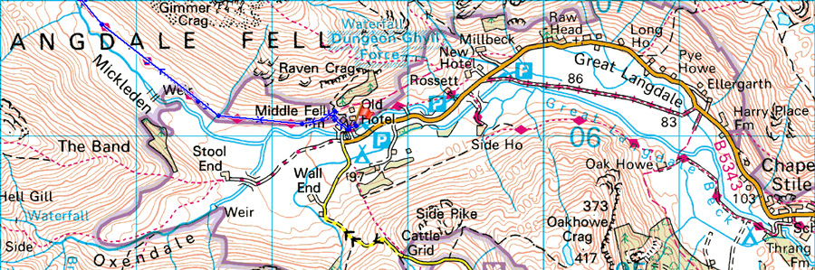 Mickleden over Rossett Gill with distant views of the Langdale Pikes, and Lingmoore Fell. |