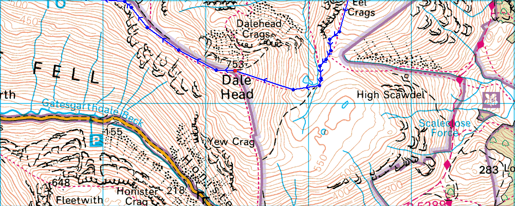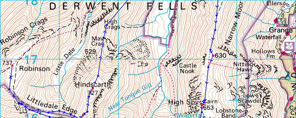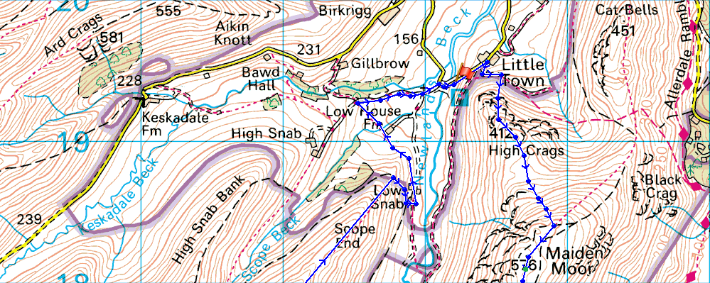 Little Town - Knott End - High Crags - Maiden Moor - Narrow Moore - Nitting Haws - High Spy - Dalehead Tarn - Dale Head - Hindscarth Edge - Littledale Edge - Robinson - Littledale Edge - Hindscarth South Top - Hindscarth - High Crags - Scope End - Low Snab - Low House Farm - Newlands Church - Little Town |