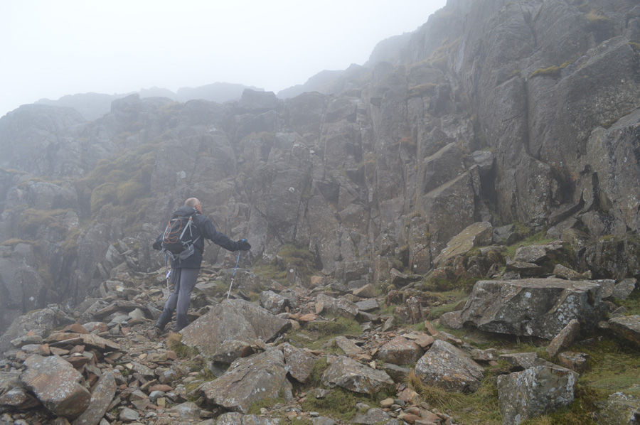 After leaving Combe Head behind under a cloak of cloud we located the path that lead us north west towards Glaramara's main ridge, but before all that we had a short and enjoyable scramble to contend with, earlier concerns were laid on whether the rock would be greasy and obviously wet due to last nights rain which is why you can see David eyeing up his route from the bottom of the crags, David was to climb right as I opt left. |