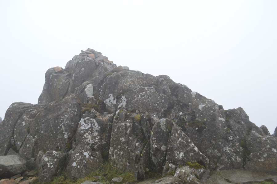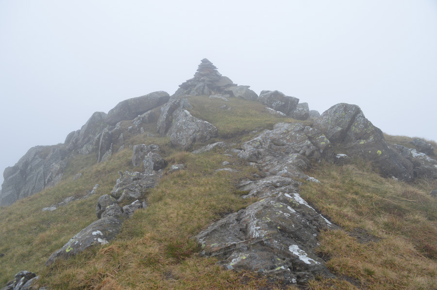 By obtaining the path we followed the dip between both subsidiary summits and soon found ourselves at the south west cairn, during which time brief views opened up into the Seathwaite Valley before quickly closing again leaving us under a wall of cloud yet again, it appears our ridge walk will sadly go unseen. |