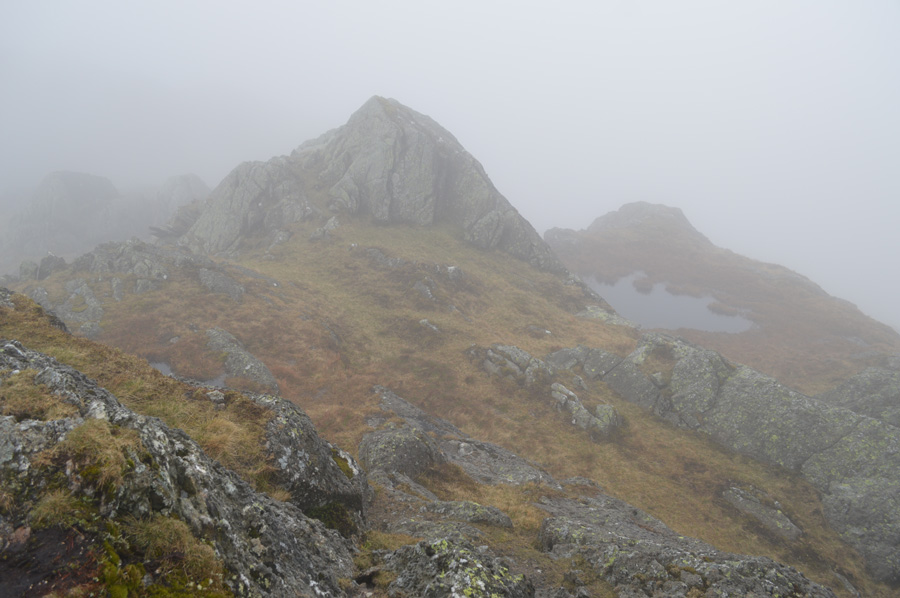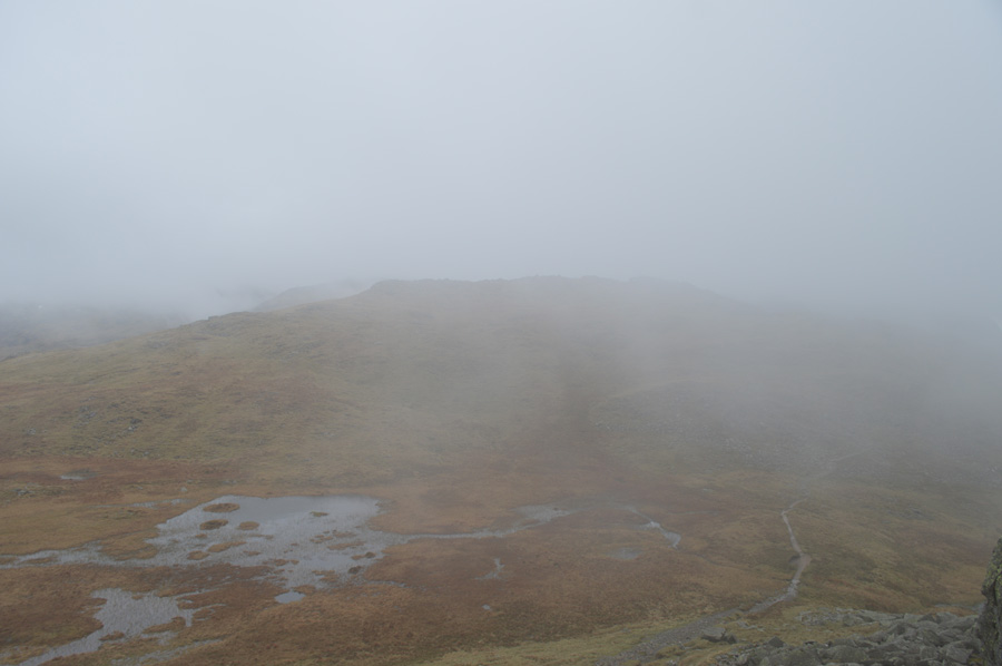 After leaving Tarn at Leaves we soon found ourselves heading into the cloud from where we could only just define the outline of Cam Crag as it appeared through gaps in the cloud which left us thinking maybe this cloud was going to lift sometime soon. |