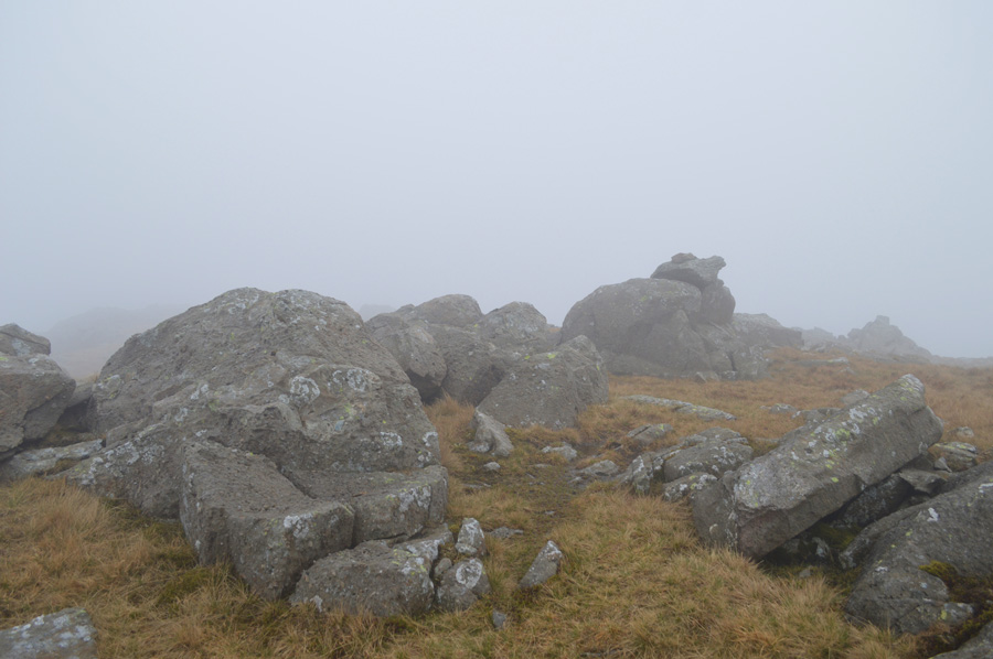 A steep pull was required to reach the interconnecting ridge between Rosthwaite Fell (Bessyboot) and Glaramara which is exactly where Cam Crag can be found, Rosthwaite Cam can also be found close by yet due to the low cloud we walked by without realising it was there, never mind. Cam Crag was soon located as the highest point as we clambered over rocky outcrop to reach its summit and claim our first two thousand foot summit of the day. |