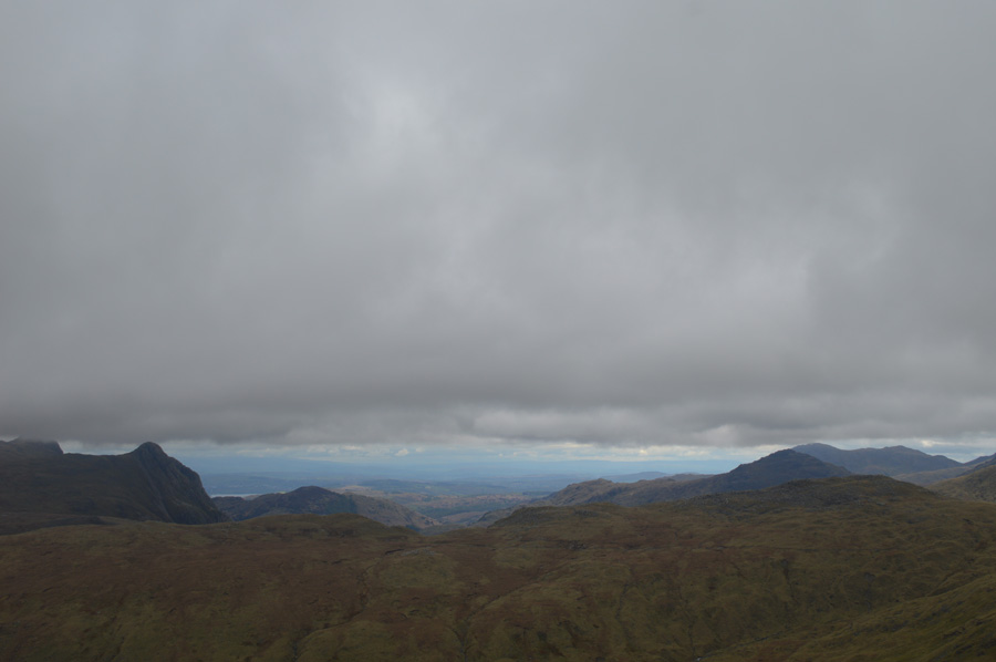 The Langdale Pikes and Coniston Fells seen over Rossett Pike and Stake Pass. |