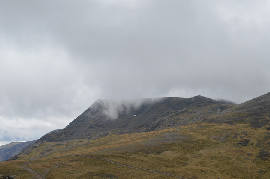The contrast between a matter of hours ago couldnt of been greater as we take in the descent towards Styhead Tarn with a warm sun on our backs and clear skies above our heads, with sleeves rolled up we pick our way down towards what appears to be a very busy Styhead Pass/Tarn. |