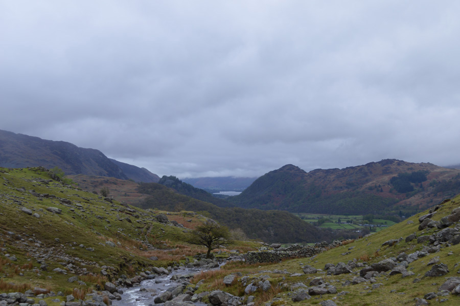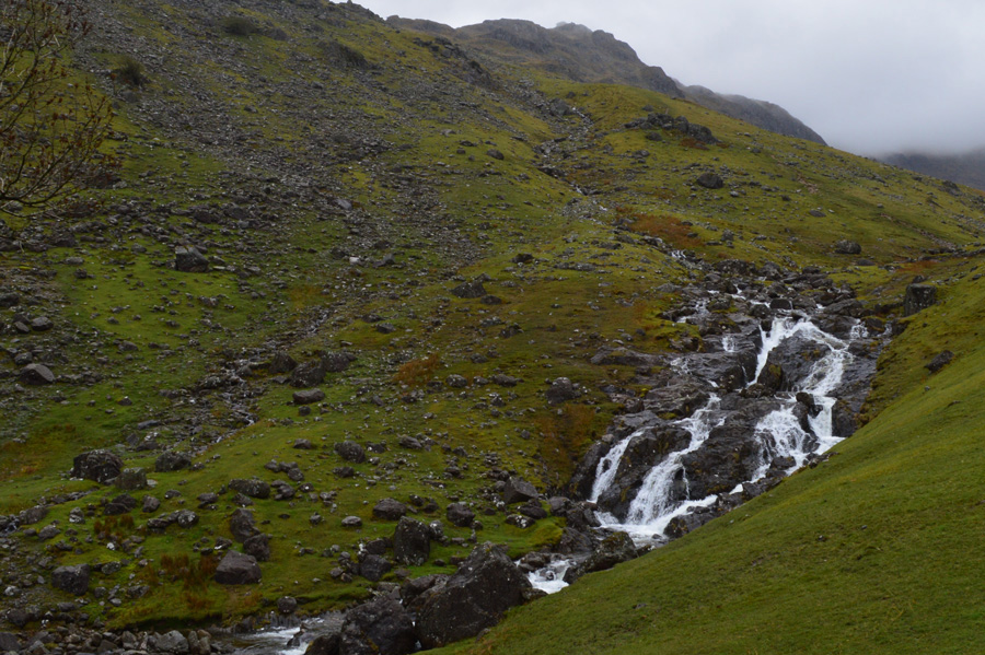 There's still drops of rain in the air carried along by a faint wind, over head the cloud is low, so low it blankets the High Scawdel fell side in a thick covering as for any longer distant views, there simply weren't any. With the car locked we headed out of Seatoller by the main road passing the road entrance for Seathwaite, instead continuing for around half a mile before picking up a loning on the right hand side from where Comb Gill is heard, well before it is sighted. |