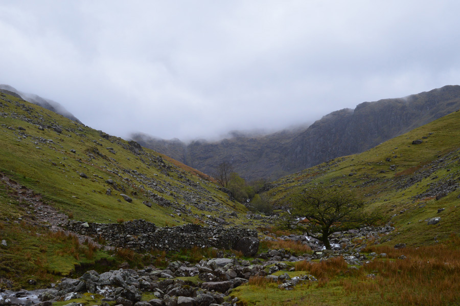 We didn't keep to the loning long before picking a path sign posted Glaramara. Our path then lead us over swollen ground which was evidence from the previous nights rain which fell so heavy it was as if Lakeland was licking its wounds come the early hours of the morning. Views into The Combe were limited due to the low cloud lingering over Combe Door which at this point, didn't show any real signs of lifting. |