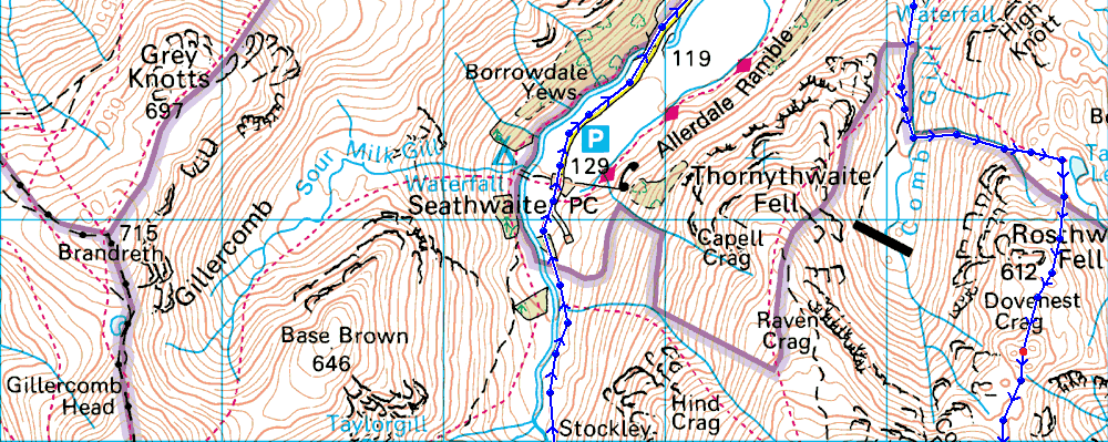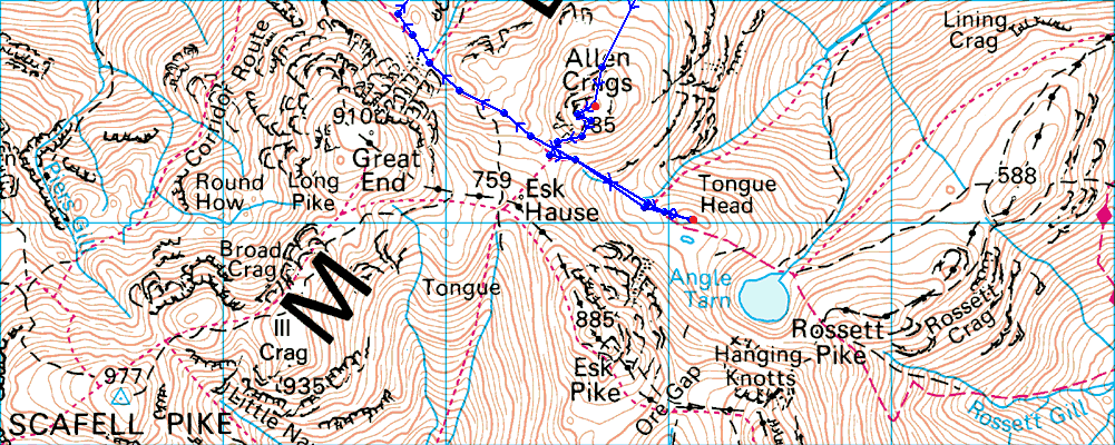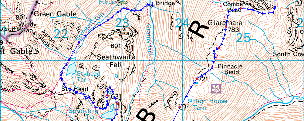 Cam Crag - Combe Head - Glaramara - Glaramara South West Top - Allen Crag Ridge (NY 243 097) - Allen Crag Ridge (NY 241 092) - Allen Crags - Tongue Head - Seathwaite Fell (NY 230 093) - Seathwaite Fell (NY 227 095) |