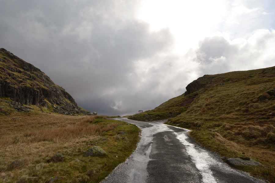 No other traffic had passed me and I was able to kit up almost in the middle of the road as the ground where I had left my car was muddy and full of holes, a high grass bank provided space from where I could take gear from the boot before attaching to my pack which was handy if anything. Soon after I had locked the car I hear the struggle of an engine ascending as it reached the top of the pass the driver gives me a wave before parking up, I passed him minutes later buffeted by the wind, we exchange mornings before I make way along the Pass before taking a left turn almost directly onto fell side. |