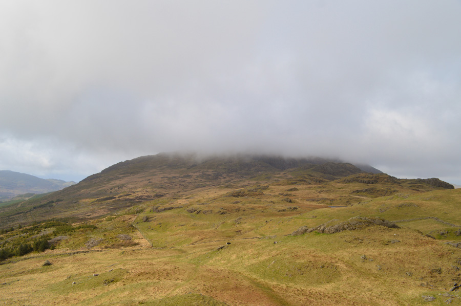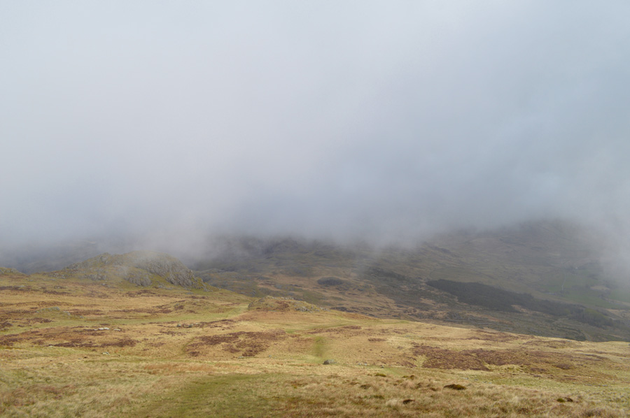 Sadly Harter Fell summit is covered by cloud, I did hope this would lift as I continued with the walk but all to no avail, however, watching the cloud streak across the fell side followed by dashes of sunshine more than made up for this. |