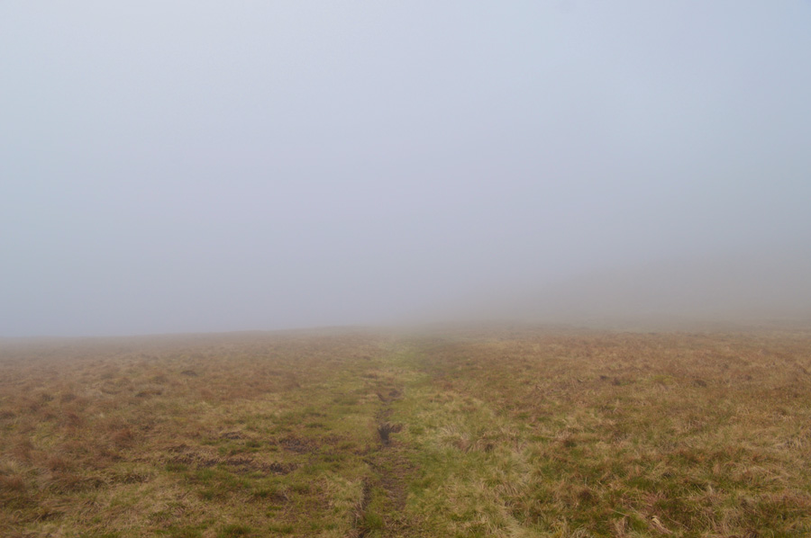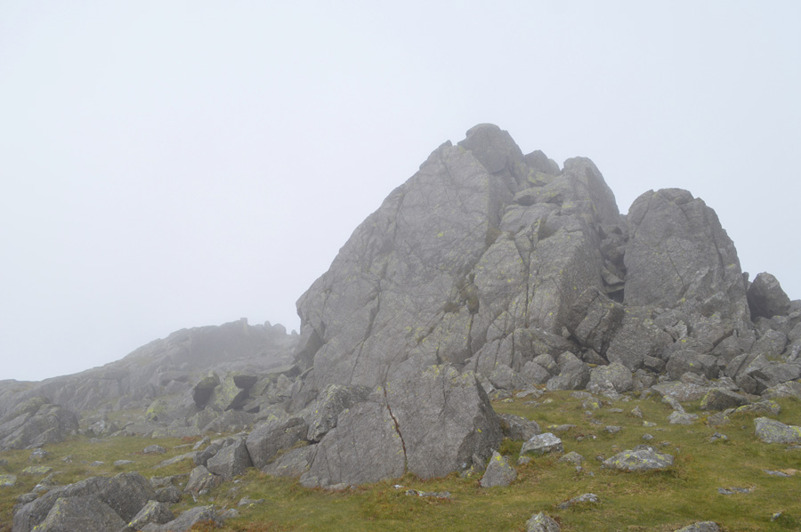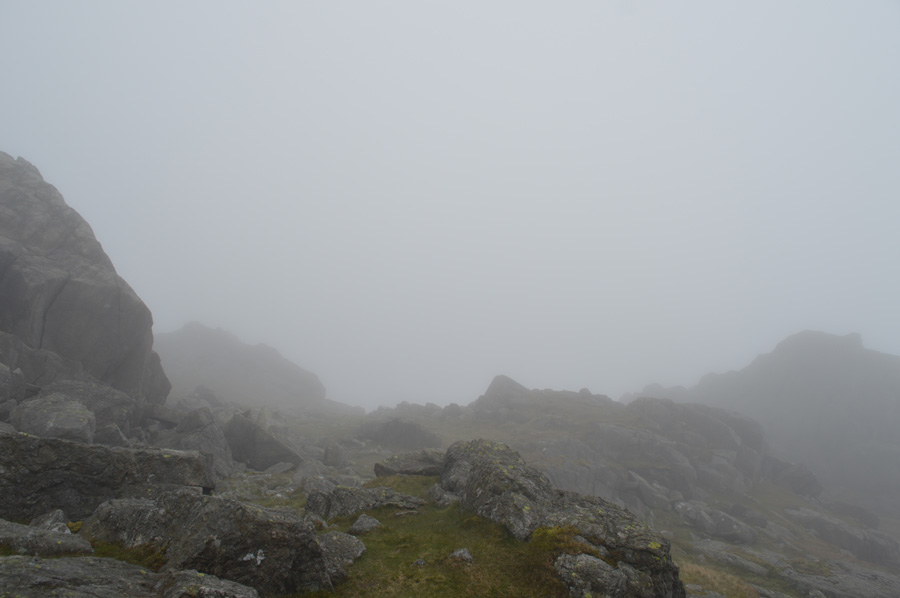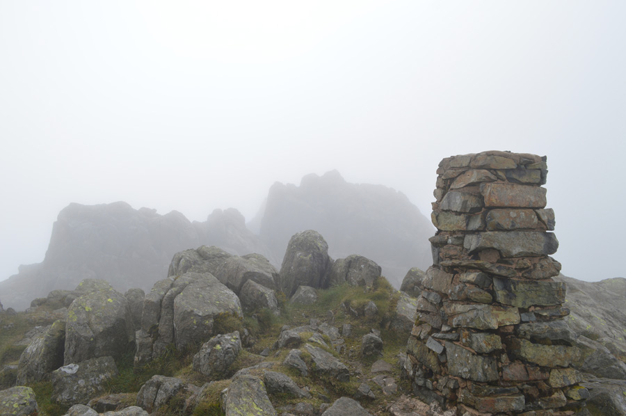 My shelter enabled me to take in my eerie surroundings listening to the wind buffet at the trig point just feet over my head which had an over whelming calming affect on me, at times the cloud would drift in totally obscuring views while at others the detail of nearby crags were outlined making summit time spent feel rather special, however I soon found myself cooling down as the wind somehow found its way under my jacket freezing the sweat on my back until I could stand no more, it was time to retreat back down. |
