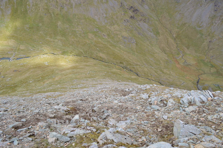 I guess it's fair to say that conversation died a little more so because of the concentration needed to find ourselves at exactly the right spot where we needed to leave the ridge. We picked our way over grass and crag until we thought we had reached our spot which turned out to be a little higher than where we needed to be, with this we continue a little further down the ridge until we were exactly sure we'd found our exit point. Even so as David would explain, if this isn't it, this is the place we needed to leave, we simply cant afford to continue any further, moments later a grassy ridge was spotted which descended into scree, this was our spot. |