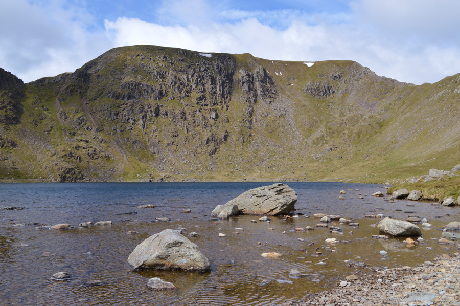 Helvellyn and Striding Edge seen domineering over Nethermost Cove. |