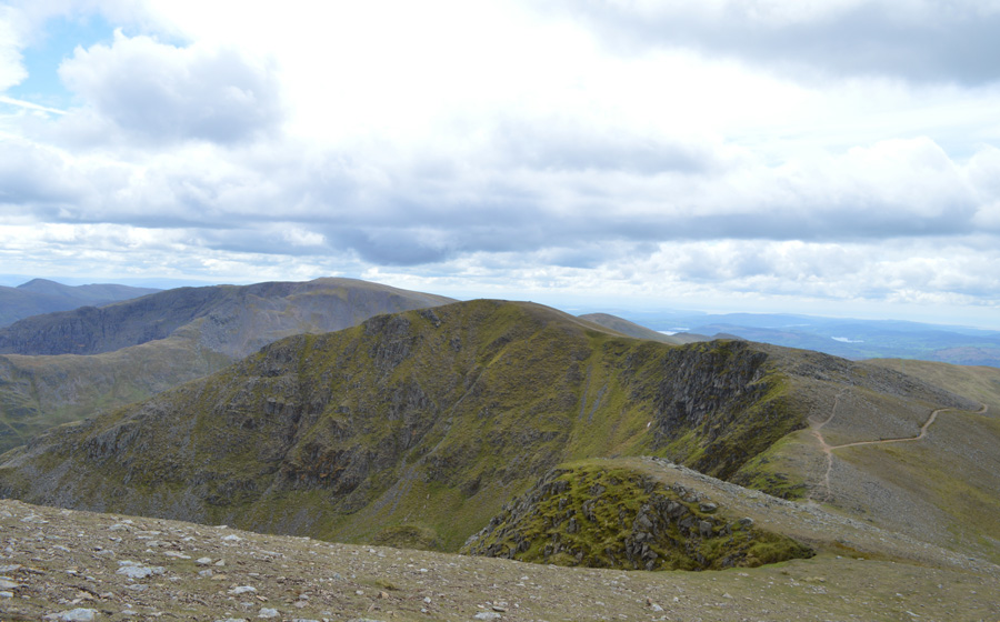 Helvellyn and Swirral Edge seen from Catstye Cam north east ridge. |