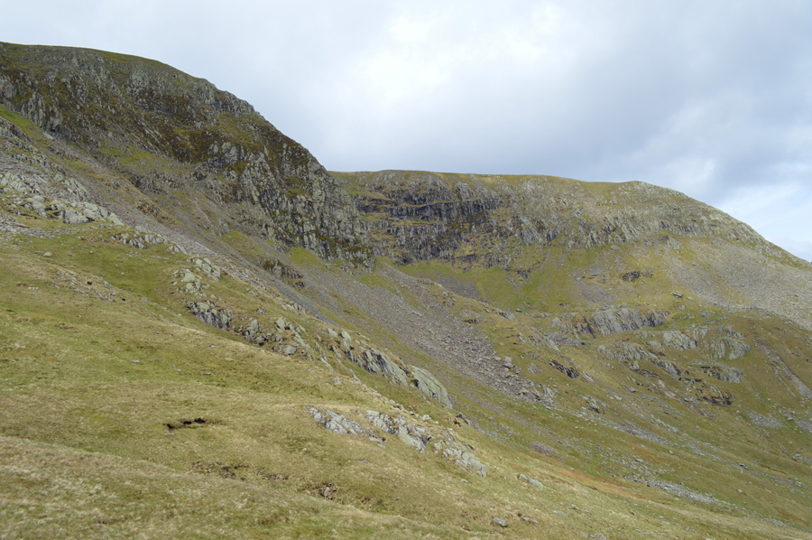 After quickly gaining high ground we now had no choice but to lose a little height as we trace our way towards the bottom of the scree seen in the centre of this photo. We are now well below Hard Tarn seen to the right of the scree (out of sight) below the rock shelf. This is the ascent we were looking on from the top of Ruthwaite Cove earlier. Ground is covered steadily and carefully more so as we track single file in order to maintain height and until we reached the bottom of the scree, from where we head further right in order to climb up onto Hard Tarn rather than drop on to it. |