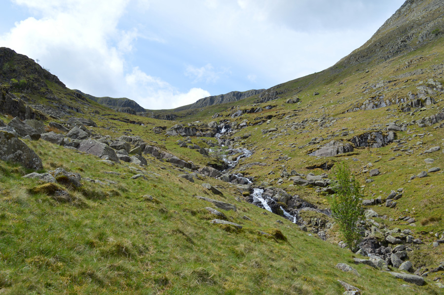 Our time exploring Nethermost Cove was over as we follow the course of Nethermost Beck, over our heads the queues would grow along Striding Edge yet sadly this was our time to leave and make descent on the valley of Grisedale. Two paths flank Nethermost Beck both as substantial as each other but we opt for the one off the right of Nethermost Beck as it will leave us in good stead for the stone wall we have to cross when we reach the valley floor. |